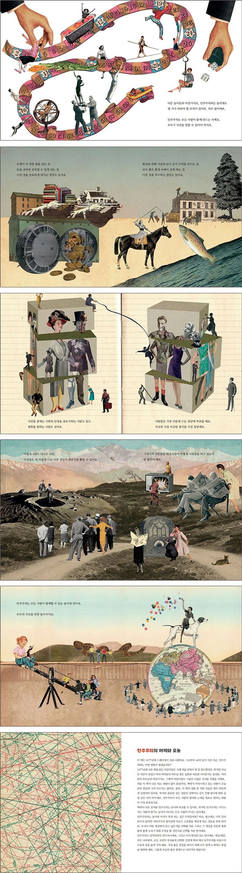 이 책은 독특한 콜라주 기법을 이용한 그림을 선보입니다. 이 그림들은 현실과 사물을 있는 그대로, 직접적으로 묘사해 내지 않고 상상력을 동원하여 만들어졌습니다. 그래서 각각의 그림들이 무엇을 의미하는지를 생각하며 보는 재미 또한 크게 느낄 수 있습니다. 마치 현대 미술관에 걸려 있는 아티스트의 작품을 보는 것 같은 느낌이 들 정도로, 이 책의 그림은 독특하면서도 완성도가 높습니다.