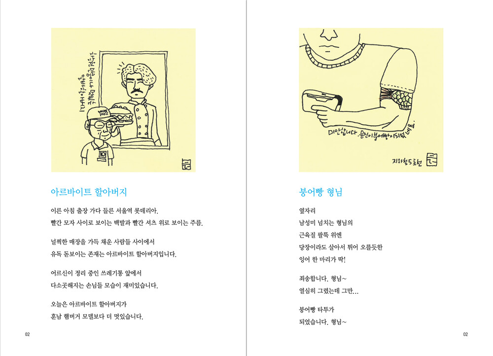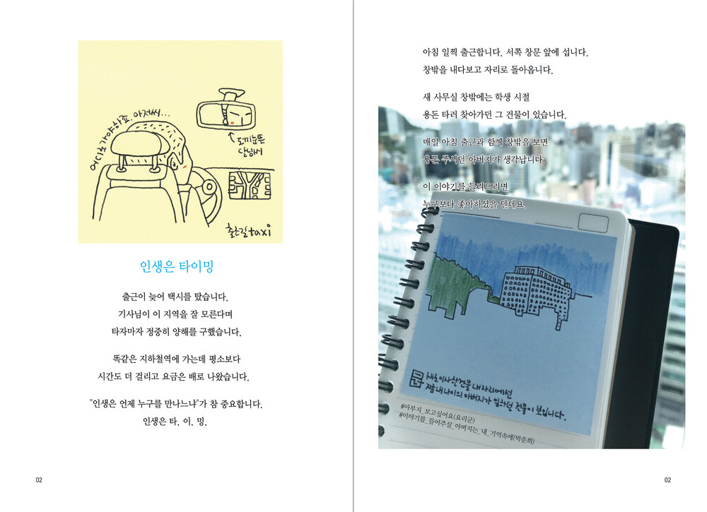 사무실을 을지로로 이사한 후 재미있는 점은 가끔 모르는 인스타그래머들의 피드 배경에 고기 굽는 입사 동기도, 맛집에 앉아 계신 옆 팀 팀장님도 보이고… (P58)
