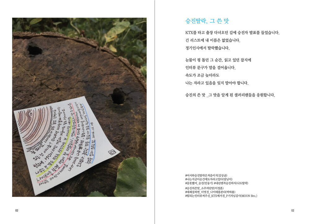 우린 실패했다하면 –(마이너스)를 생각하지. 하지만 성공도 실패도 인생의 지층처럼 쌓이는 거야. 그래 사실을 알고보면 실패도 +(플러스)인거야. 잊지마 지금 이시간에도 삶의 지층은 쌓여가고 있어. (P154)