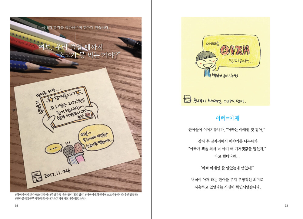 팀 워크숍을 가게 되었습니다. ‘워크숍’이란 단어를 처음 듣는 어린이에게 아내가 명쾌하게 설명해 주었습니다. “응 초등학교에선 소풍, 대학생은 MT, 회사에선 워크숍이라고 해” “아! 아빠 놀러가는구나.” (P139)
