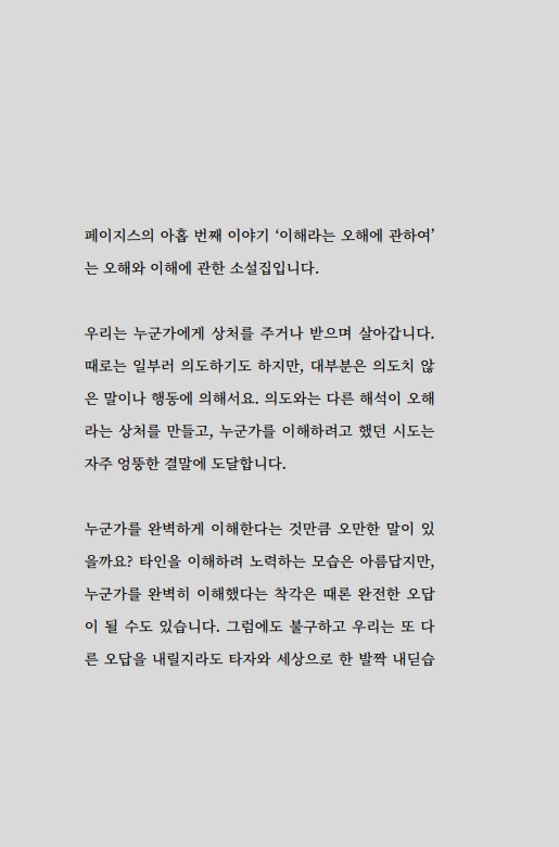 페이지스의 아홉 번째 이야기‘이해라는 오해에 관하여’는 오해와 이해에 관한 소설집입니다.