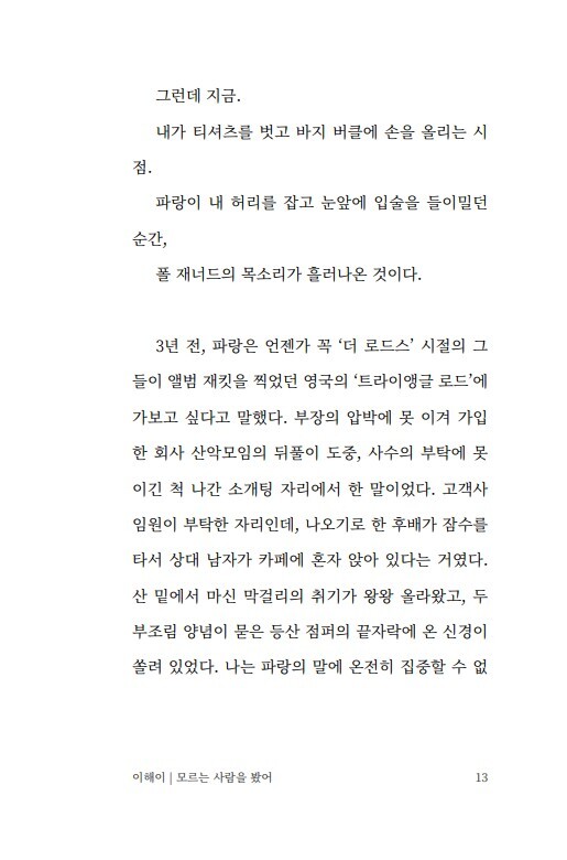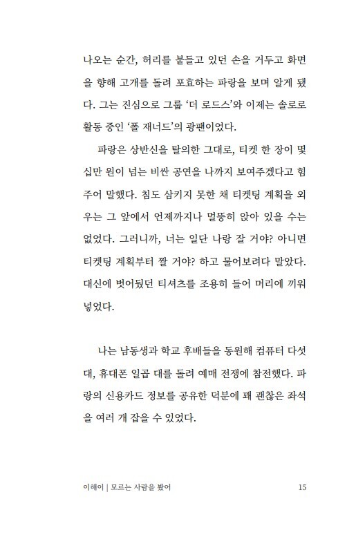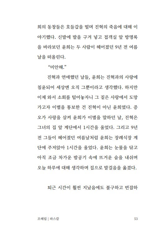 집 앞 꼬치구이 가게에서 부장 욕을 하며 맥주를 마셨다. 이야기의 결론은 늘 같았다. 다시 글을 쓰고 싶다는 것이었다. 내가 작가가 되면 부장 욕부터 쓸 거야. 사내 정치 이야기를 써야지. 편입도 하고 싶어. 그렇지만 확신도 없는데 일을 그만두고 진학해 글을 쓰는 건 정말 미친 짓 같아. 내후년이면 나도 서른인데. 모두가 어딘가에 제 자리를 찾아 머무르기 시작하는데, 나만 뭔가를 향해 걷는다는 건미친 짓이잖아. 확신도 없는 일에 뛰어들었다가, 등단을 못하고, 결국은 변변찮은 직업도 없이, 평생 길을 잃고 방황하는 삶을 살면 어떡하지. 나는 사대보험이 없는 삶이 정말 두려워. 사대보험이랑 거리가먼 내 꿈이 너무 좋아서 지겹고 싫어. 내가 말하자 늘 묵묵히 듣기만 하던 파랑이 그날따라 이렇게 말했다.