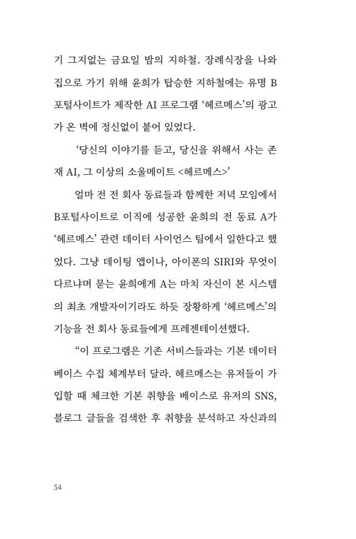그래서인지 처음엔 ‘로피탈’과 같은 수학 관련 닉네임들을 헤르메스가 매칭시켰으나 윤희는 당황한 나머지 ‘거절’을 내뱉었다. 5번 정도 여러 아이디가 매칭됐으나 윤희는 첫 채팅의 어색함을 이기지 못하고 ‘거절’ 혹은 ‘나가기’를 연거푸 말했다. 그러다 잠들기 전 마지막에 매칭된 상대는 ‘HYEIN’이란 아이디의 유저였다.