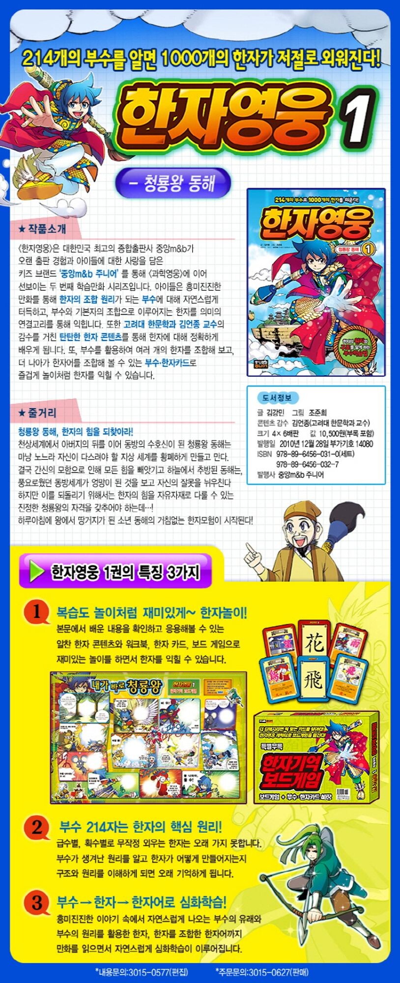 한자의 원리와 구조를 배우는 부수천자문『한자영웅』제 1권 청룡왕 동해편. 아이들은 흥미진진한 만화를 통해 한자의 조합 원리가 되는 부수에 대해 자연스럽게 터득하고, 부수와 기본자의 조합으로 이루어지는 한자를 의미의 연결고리를 통해 익힐 수 있는 교재다. 또한 고려대 한문학과 김언종 교수의 감수를 거친 탄탄한 한자 콘텐츠를 통해 한자의 기초부터 심화학습까지 학습할 수 있다. 부수를 활용하여 여러 개의 한자를 조합해 보고, 더 나아가 한자어를 조합해 볼 수 있는 카드로 즐겁게 놀이처럼 한자를 익힐 수 있다.
