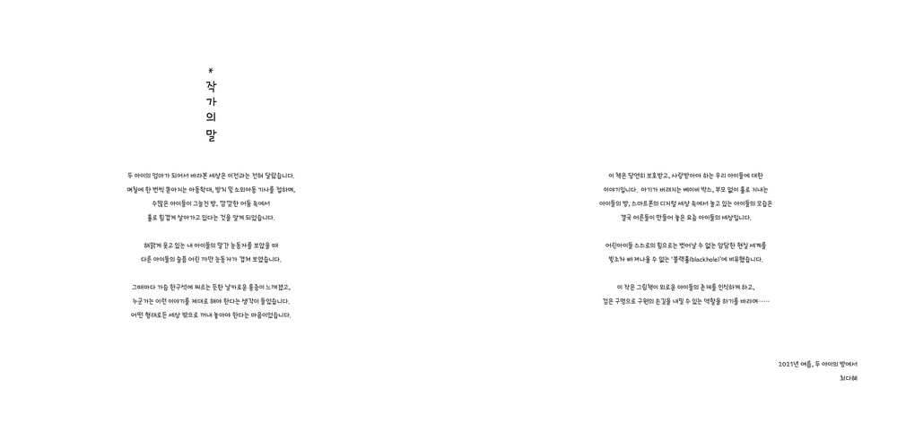 “우리가 사는 이 세상에는 블랙홀이 존재한다. 그리고 결코 스스로의 힘으로는 벗어날 수 없는 시간과 공간에 갇혀서 홀로 살아가는 외로운 아이들이 있다”