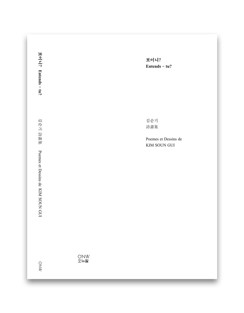 프랑스를 기반으로 작품 활동을 펼쳐온 김순기 작가의 시화집 《보이니? Entends-tu?》는 그동안 꾸준히 작업해온 한글 시와 불어 시, 그리고 서예와 드로잉이 함께 엮여진 창작집으로 비디오, 사진 등 다양한 매체의 시각예술 분야를 넘어 철학과 문학의 영역으로 넓게 열려 있는 그의 작업은 장르의 경계를 두지 않는 ‘열린’ 사유에 기반한다. 작가는 멀티 미디어를 단순히 예술의 한 장르가 아닌 ‘존재와 생각, 그리고 보고, 듣기의 열린 방식’이라고 말한다. “보이니?”라는 제목으로 출간되는 이번 시화집 역시 그의 삶과 예술에 대한 사유의 흐름을 시와 드로잉에 담아 한 권의 책으로 제시하고 있다. “보이니?”라는 제목에서 시사하듯 이 책은 단순히 시각적인 영역을 넘어 정신의 영역, 즉 마음에 바탕을 둔 ‘보다’라는 그의 미학적 개념을 집약하고 있다. 노장사상, 불교사상과 함께 비트겐슈타인의 언어철학에 대한 관심을 바탕으로 삶과 예술에 대한 사유를 심화해 온 그의 작업은 오랜 시간 지속적으로 병행해온 글쓰기와 연결된다. 그에게 언어는 규정되고 닫힌 도구화된 언어가 아닌 상황과 맥락에 따라 늘 변화하는 열려진 삶의 형태이며, 이때에 ‘보다’라는 행위는 작가 자신이 부재한 무아(無我)의 상태에서 텅 비고 열려진 마음으로 삶과 호흡하는 것이다. 이러한 점에서 시는 어떠한 목적성이나 규율성을 벗어난 열려진 언어로 일상적 삶과 자유롭게 유희하는 것이라고 작가는 말한다. “(…) 김순기의 서화(書畵)는 재현 내부에서 재현되지 않은 것, 재현될 수 없었던 것을 솟아나게 한다. (…) 김순기의 서화는 아주 오랜 숙성을 포함하고 있다. 그는 동양의 고전적 미학 원리 중의 하나인 정중동을 절묘하게 전용하여 예기치 않은 것의 발견, 억제되었던 것의 상큼한 출몰이라는 사건을 일으킨다. 나는 김순기 글-그림의 미학적 원리를 ‘서행(徐行)의 도약’이라고 정의하고 싶다. “눈송이의 발걸음으로 달리는 멧돼지”의 이미지가 가리키는 것이 바로 그 천천히 가는 비약이다.” (정과리, 문학평론가) 그 동안 집필해 온 김순기의 글은 국내외 다양한 저널에 소개되어왔고, 《게으른 구름 (Nuageparesseux)»(1999); 《산, 그것은 바다요: 장자와 비트겐슈타인 (Montagne, c’est la mer: Tdchouang-Tseu et Wittgenstein)》 (2003), 《예술 혹은 침묵의 청취: 김순기_ 자크 스페이스 오뉴월 Space O'NewWall www.onewwall.com 서울시 성북구 선잠로 12-6 Tel 070-4401-6741 Fax +82-2-742-6741 onewwall@gmail.com 데리다, 장-뤽 낭시, 존 케이지와의 대화 (Art or listen to the silence: Soun-Gui Kim in conversation with Jacques Derrida, Jean-Luc Nancy & John Cage)》, (DVD/Book, 2014) 등 여러 권의 책들도 출간되어왔다. 이번에 출간되는 시화집 《보이니? Entends-tu?》는 그동안 꾸준히 작업해온 한글 시와 불어 시, 그리고 서예와 드로잉이 함께 엮여진 창작집이다. 이번 시화집의 출판기념회 및 ‘작가와의 만남’이 10 월 4 일 화요일 오후 4 시부터 스페이스 오뉴월의 프로젝트 공간인 오뉴월 이주헌 利宙軒에서 열린다. ‘작가와의 만남’에서는 초청 패널로 문학평론가 장-미셸 라바테(Jean-Michel Rabaté)와 연세대 국문과 교수이자 문학평론가인 정과리 선생님을 모시고 작가 김순기의 작업세계에 대한 이야기를 나눌 예정이다.
