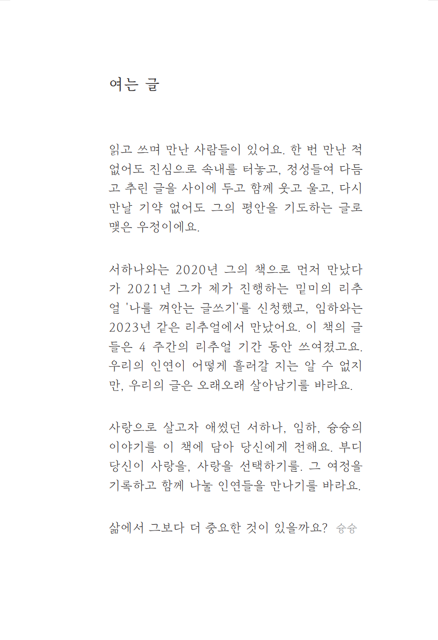 이 책은 마음성장플랫폼 밑미에서 수년간 글쓰기 리추얼을 진행하며 모은 슝슝의 글과