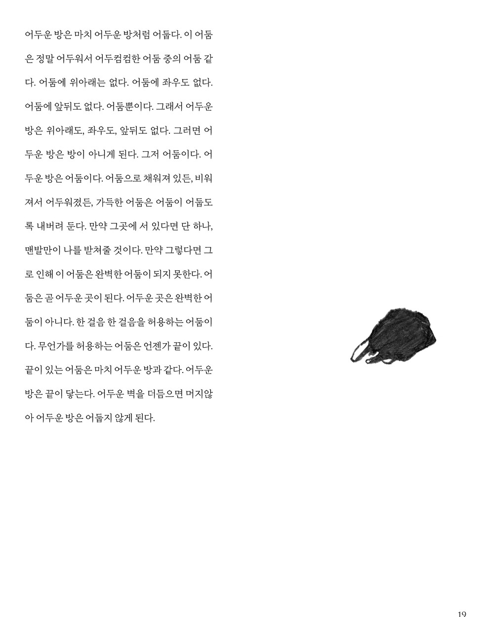 - 어두운 방은 마치 어두운 방처럼 어둡다. 이 어둠은 정말 어두워서 어두컴컴한 어둠 중의 어둠 같다. 어둠에 위아래는 없다. 어둠에 좌우도 없다. 어둠에 앞뒤도 없다. 어둠뿐이다. 그래서 어두운 방은 위아래도, 좌우도, 앞뒤도 없다. 그러면 어두운 방은 방이 아니게 된다. 그저 어둠이다... (중략)