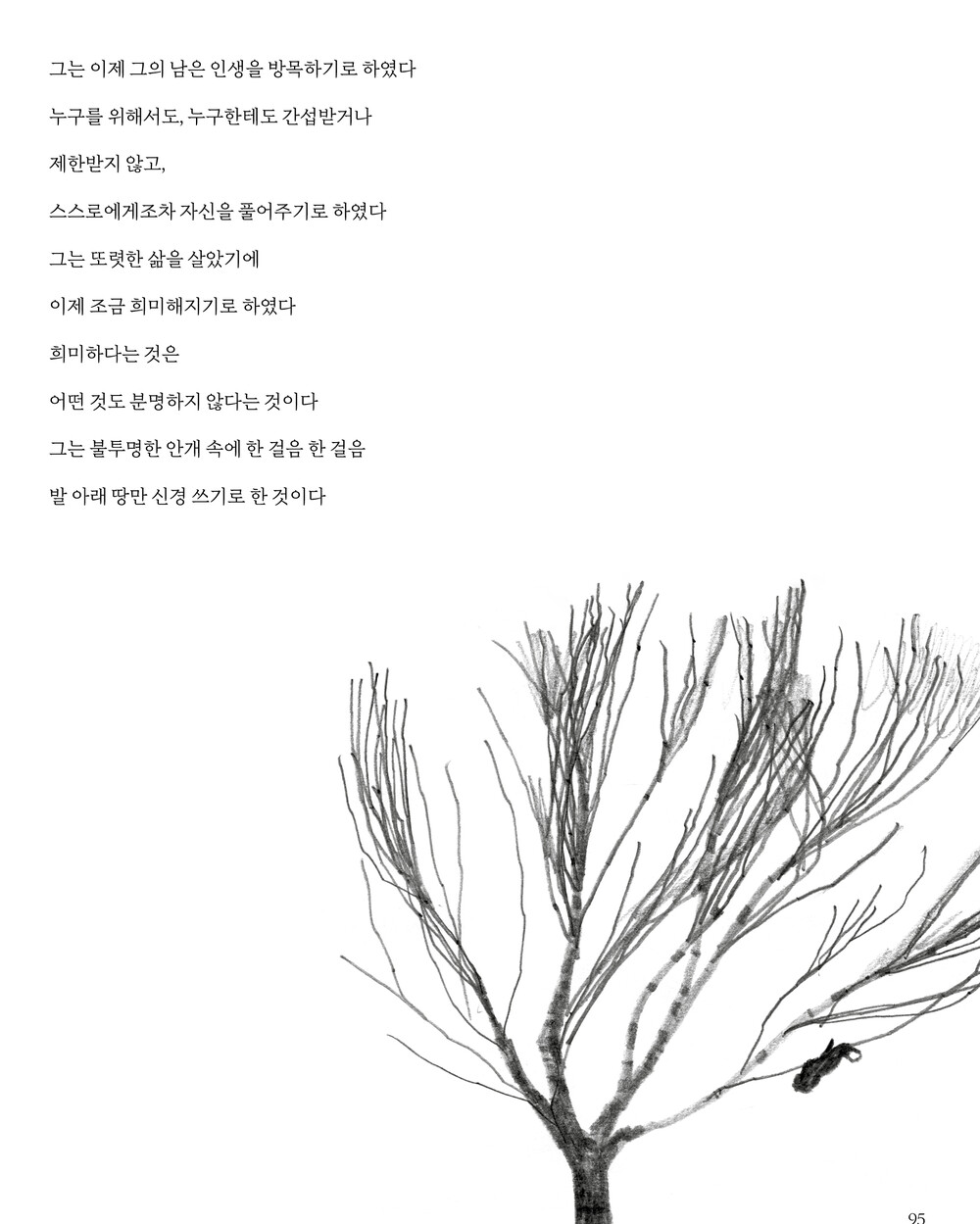 - 그는 이제 그의 남은 인생을 방목하기로 하였다. 누구를 위해서도, 누구한테도 간섭받거나 제한받지 않고, 스스로에게조차 자신을 풀어주기로 하였다. 그는 또렷한 삶을 살았기에, 이제 조금 희미해지기로 하였다...(중략)