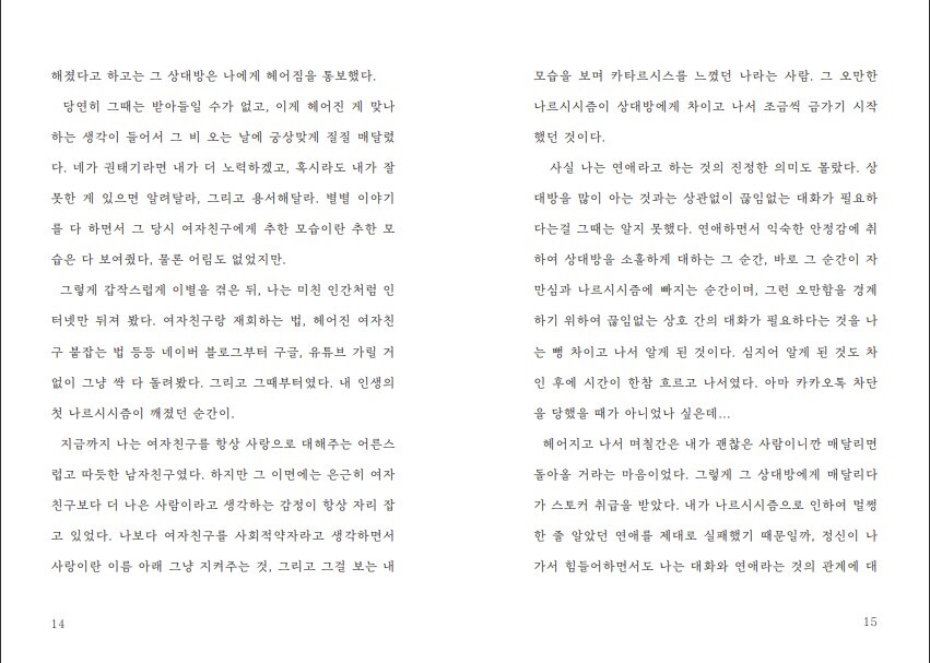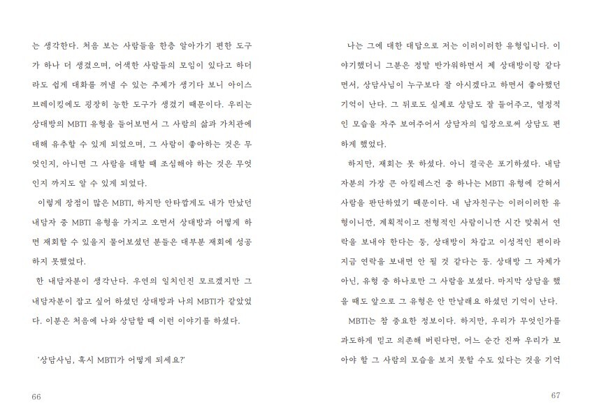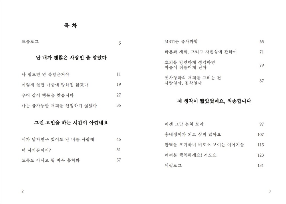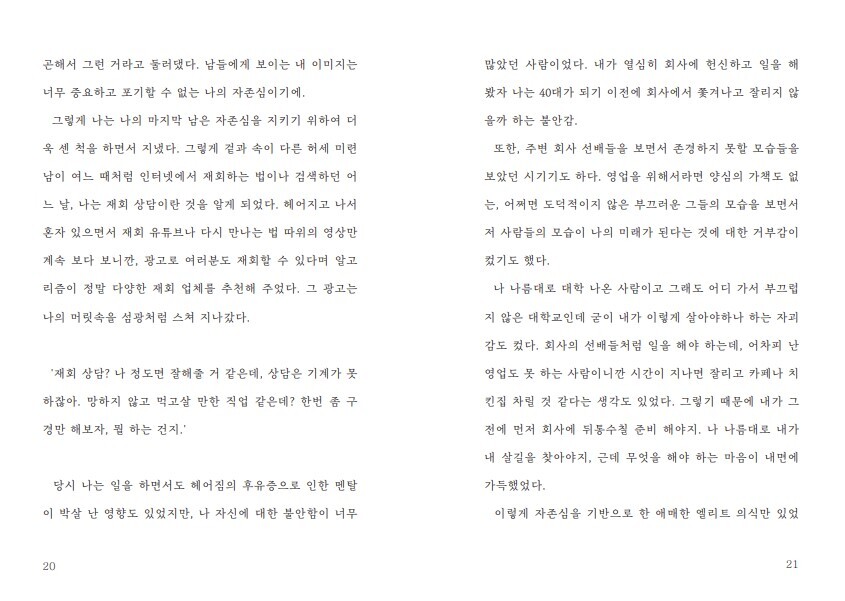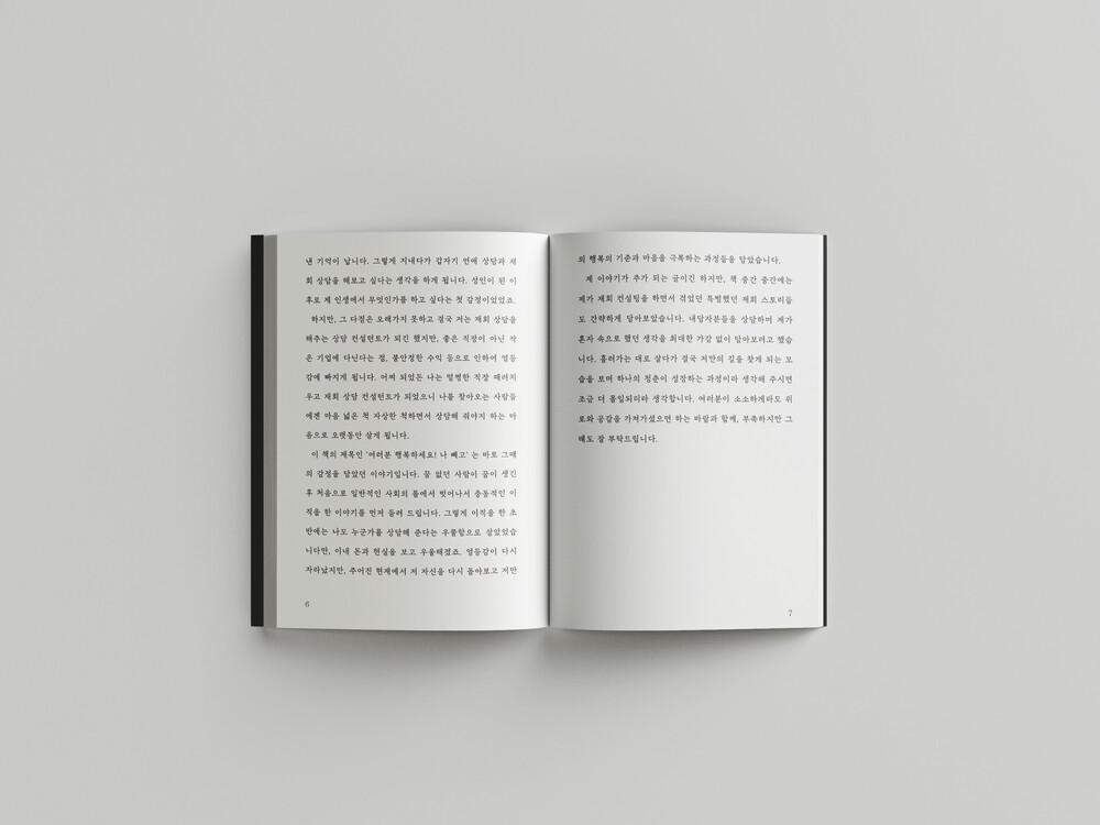 이 책을 읽는 독자 분들도 책 속 화자를 작가가 아니라 자신의 경험담이라 생각하고 읽어주신다면, 괜찮은 척이 아닌 괜찮은 사람이 되는 과정을 같이 경험 하실 수 있지 않을까 하는 바램을 가져봅니다.