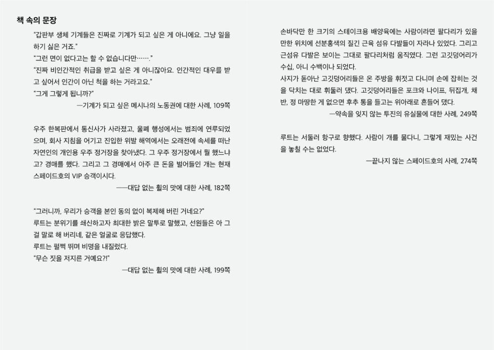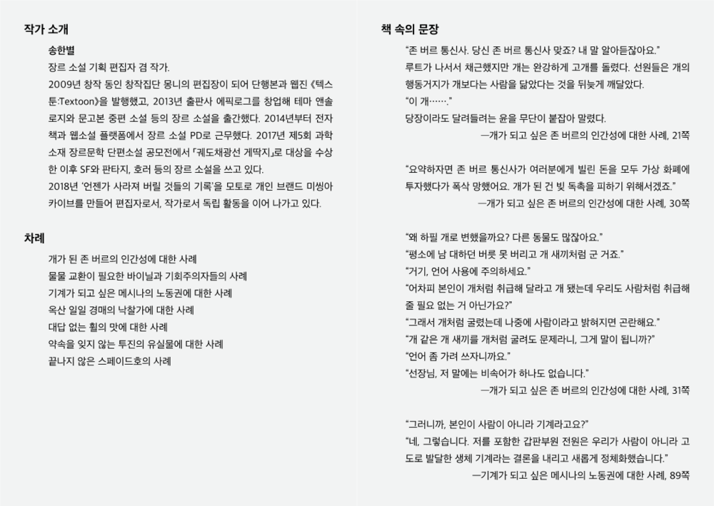 장르 소설 편집자이자 작가인 송한별이 쓴 코미디 SF 소설로, 7개의 크고 작은 에피소드로 구성되어 있습니다.