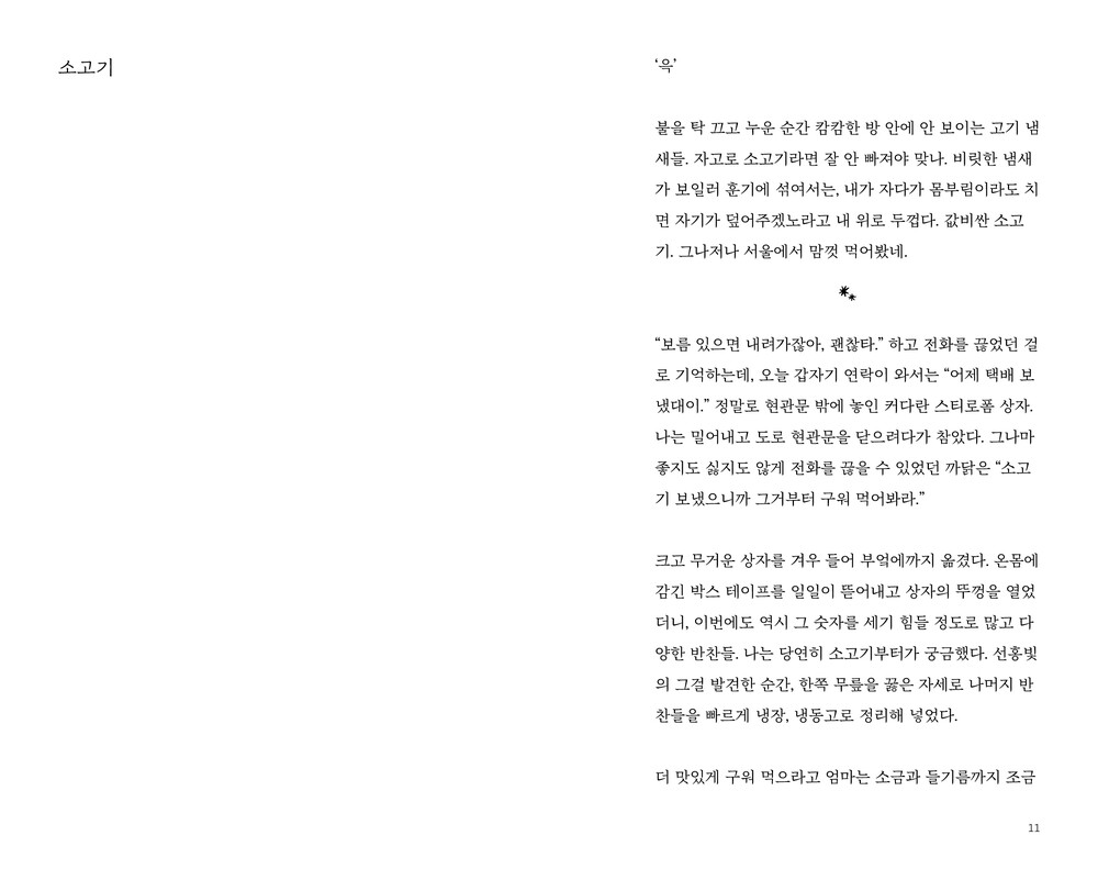 일 년에 걸쳐 쓴 원고를 편집자에게 보낸 날, 제가 받은 답장은 글의 절반가량을 빼거나 고치라는 것이었습니다. 분에 차 떨리는 말투로 계약을 파기해 달라는 부탁을 드리고, 저는 잠시 서울을 떠나 있다가, 2019년 다시 돌아와 당시에 써둔 그대로의 원고로 <동이 틀 때까지> 수필집을 독립 출판했습니다.