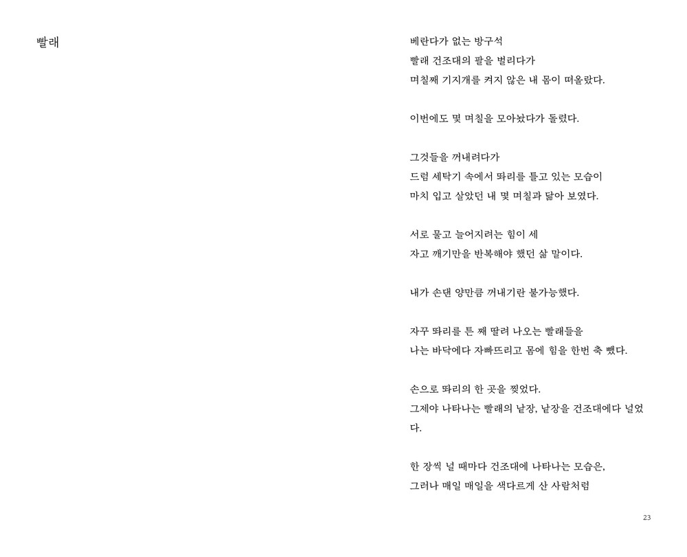 <그 시절 나는 강물이었다>(2018, 별빛들), <동이 틀 때까지>(2019, 독립출판), <변변찮은 삶을 위한 변명>(2022, 웜그레이앤블루), <가장 나일 때의 부끄러움>(2025, 학종이)