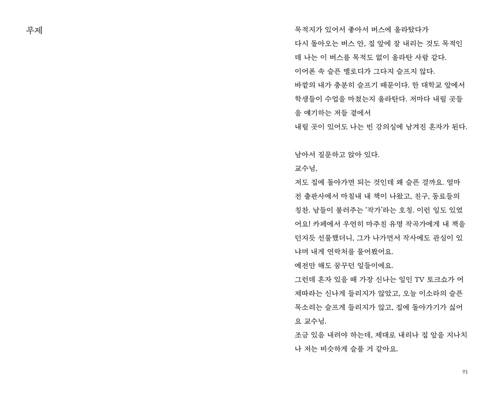 …(중략)긴 오르막길만 끝나면 와우산 공원이라 산책하기가 즐겁다. 산책 후엔 그러나 똑같은 오르막길을 내려가는 일이 남았다. 한참 전에 남학생들과 마주쳤던 오르막길 입새의 가로등이 어쩐지 쓸쓸하게 보였다. 집 근처에서 쓰레기 수거차와 마주친다. 올라타 있던 두 분이 내려 편의점 앞의 쓰레기들을 수거해 가는데, 조그마한 편의점에서 많이도 나왔다. 대학생들을 생각한다. 대출을 받을 땐 무서운 액수로 대출을 받아 사용하는 곳은 어쩌면 여기 편의점과 같은 곳들. 그럼에도 오르막길 입새에서 또 다시 대출 걱정을 했으니, 정작 살이 찐 건 저기 종량제 봉투들뿐이다.