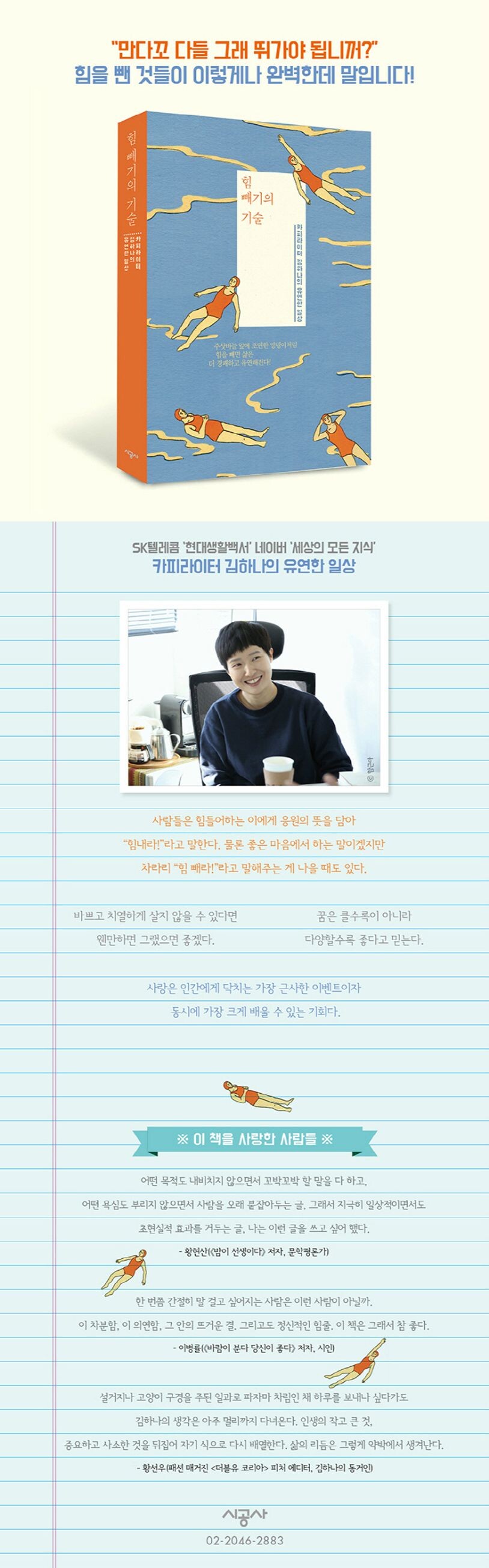 물속에서 수영을 하다 온몸에 힘이 빠져 허우적대는 사람에게는 “힘내라!”라고 말하면 안 된다. 그때는 힘을 더 소모하지 말고 온몸에서 힘을 뺀 채 둥둥 떠 있어야 한다. 계속 힘을 내려다간 결국 가라앉고 만다. 이처럼 저자는 우리를 감싸고 있는 속도감이나 허세, 걱정, 치열함에서 벗어나 힘을 쭉 빼고 삶을 더 경쾌하고 유연하게 살아갈 수 있도록 응원의 메시지를 전한다. 더불어 읽는 동안 모두 함께 책이라는 공간에 모여 글로 대화하는 듯한 느낌을 주는 문학평론가 황현산, 이병률 시인, 그리고 저자의 동거인이자 패션 매거진 《더블유 코리아》의 황선우 에디터의 추천사가 책을 읽는 즐거움을 더해준다.