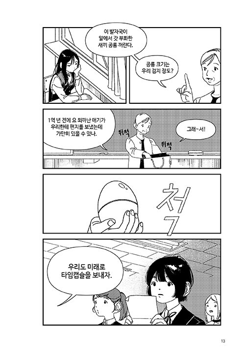 그리고 담임 선생님은 ‘1억년 전에 쬐까난 애기가 편지를 보냈는데 가만있을 수 있나’라시며, 반 친구들과 타임머신을 만들어 묻기로 합니다.