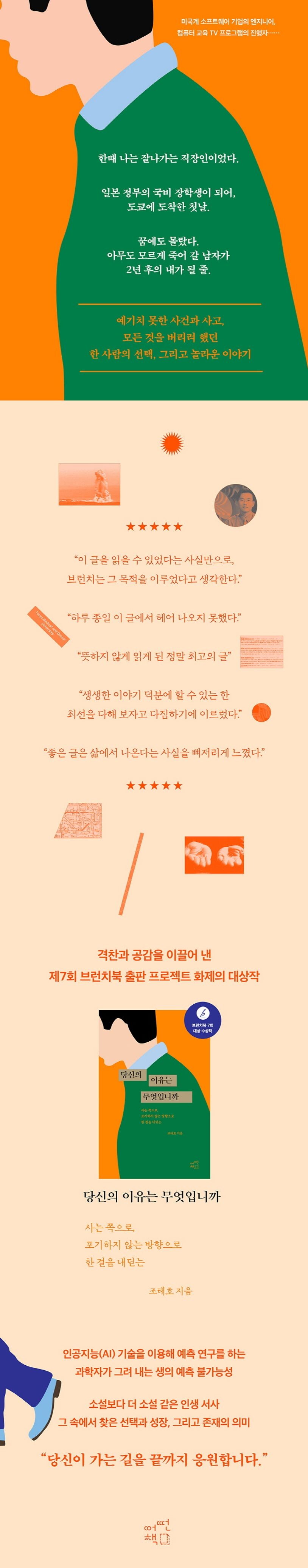 《당신의 이유는 무엇입니까》는 조태호 작가가 처음 선보이는 개인적 스토리텔링으로, 한국, 일본, 미국을 배경으로 개인사와 사회사가 긴밀하게 교차하며 극적으로 전개된다. 우리나라 컴퓨터 산업의 초창기 풍경, 실업난, 일본 경제의 호황과 불황, 한일관계 역사 이슈, 대학원 내 위계 갈등, 동일본 대지진, 인공지능과 머신러닝의 치열한 현장 등 동시대를 사는 독자라면 한번쯤 마주했을 이슈와 사건 들이 생동감 넘치게 펼쳐진다. 그런 가운데 화려했던 과거에의 집착, 사회적 시선에 갇힌 자아, 팩트와 느낌의 상관관계, 시간과 공간의 의미 등 막다른 골목에 다다랐을 때 우리가 골똘하게 되는 심리적, 철학적 문제들이 끊임없이 제기된다. 그리고 이러한 흥미로운 스토리텔링 너머 독자들이 당도하게 되는 지점은 우리가 인생이라고 부르는 것의 진면모다.