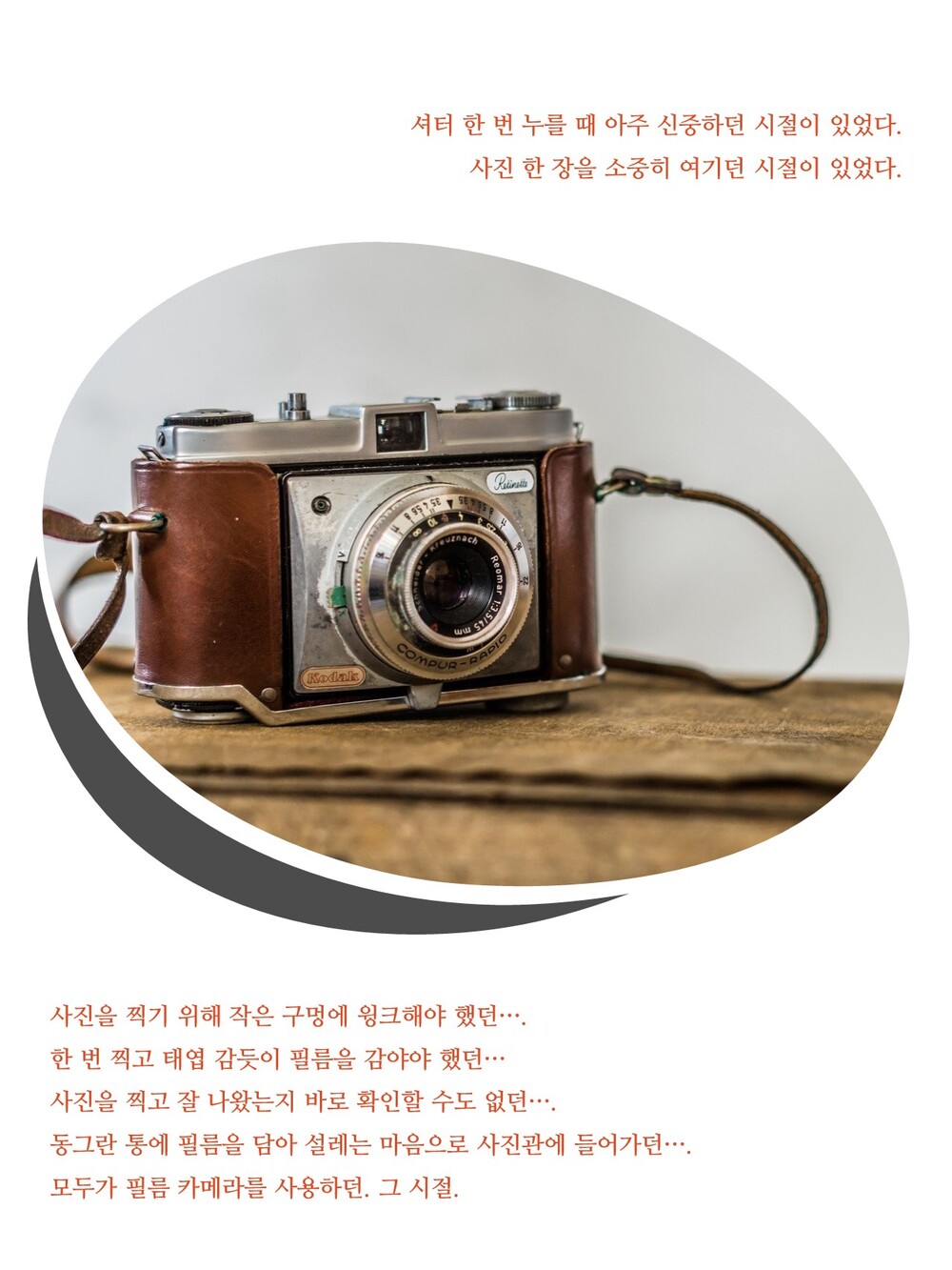 셔터 한 번 누를 때 아주 신중하던 시절이 있었다. 사진 한 장을 소중히 여기던 시절이 있었다. 사진을 찍기 위해 작은 구멍에 윙크해야 했던…. 한 번 찍고 태엽 감듯이 필름을 감아야 했던…. 사진을 찍고 나서 잘 나왔는지 바로 확인할 수도 없던…. 동그란 통에 필름을 담아 설레는 마음으로 사진관에 들어가던…. 모두가 필름 카메라를 사용하던. 그 시절.