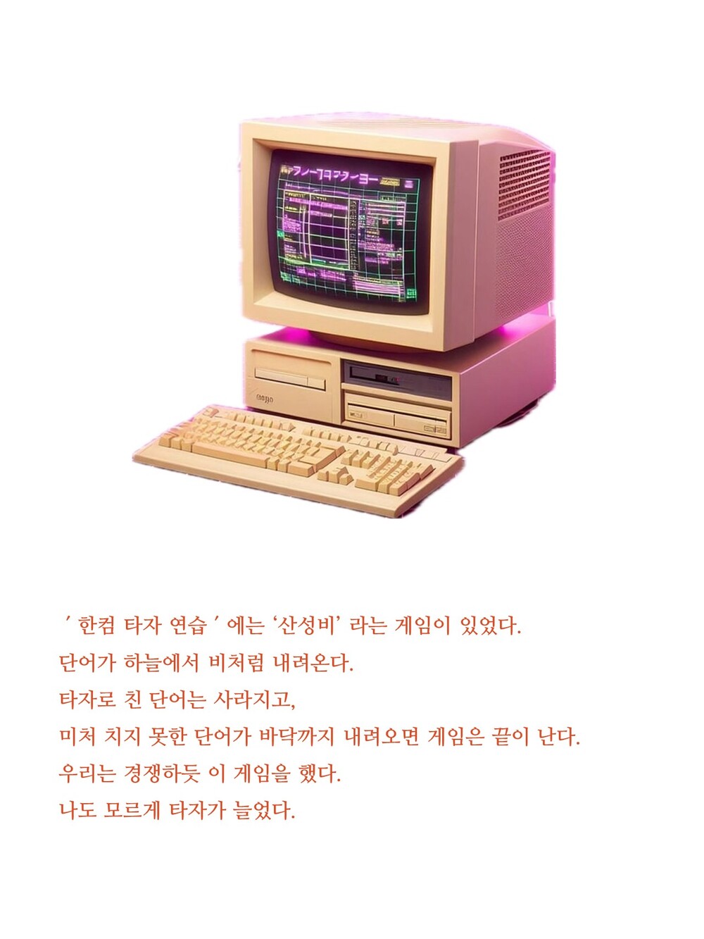 한컴 타자 연습’에는 ‘산성비’라는 게임이 있었다. 단어가 하늘에서 비처럼 내려온다. 우리가 할 일은 내려오는 단어를 빠르게 타자로 치는 것이다. 타자로 친 단어는 사라지고, 미처 치지 못한 단어가 바닥까지 내려오면 게임은 끝이 난다. 단계가 높아질수록 비가 내리는 속도가 빨라진다. 우리는 경쟁하듯 이 게임을 했다. 나도 모르게 타자가 늘었다.