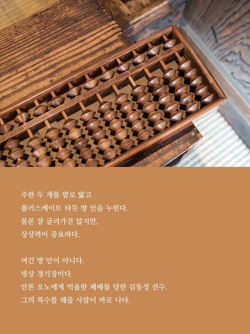 주판 두 개를 발로 밟고 롤러스케이트 타듯 방 안을 누빈다. 물론 잘 굴러가진 않지만, 상상력이 중요하다. 여긴 방 안이 아니다. 빙상 경기장이다. 안톤 오노에게 억울한 패배를 당한 김동성 선수. 그의 복수를 해줄 사람이 바로 나다.