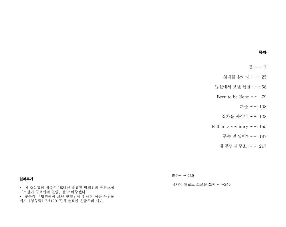 "태어나 처음 꾼 꿈이 천재(「천재를 찾아라!」)"인 그는 "한번쯤 소설에서나 일어날 법한 일들이 내게도 일어나길(「틈」)" 바라고, "고유하고 독창적인 스타일로 꼭 쓰고 싶은 이야기(「병원에서 보낸 한철」)"를 간직한 인물이다. 고급 와인을 마시며 "돈의 맛. 즐길 수만 있다면 즐기고 싶은 맛(「Born to be bone」)"이라 생각하고, 자주 시니컬하나 "종종 약간의 감상주의에 빠지는 탓(「퍼즐」)"에 사건에 휘말리기도 하며, "누군가를 골려주고 싶었고 실컷 가지고 놀다 내팽개치고(「살가운 사이비」)" 싶은 충동에 휩싸이기도 한다. "누구와 이야기를 나눠도 곧잘 삐걱거림을 느끼고, 한번 삐걱대는 그 찰나에 한없이 깊은 낭패감으로 다이빙(「Fall in L……ibrary」)"할 정도로 낙담에 취약하지만, 그런 상황에서도 "일단 할 수 있는 걸 하자(「무슨 일 있어?」)"고 말하는 인물이다. 아홉 획으로 그려내는 윤평의 초상화는 독자들로 하여금 동시대 문청의 생활과 삶을 엿볼 수 있도록 도울 것이다. 그런데 이상한 부분을 못 느꼈는지. 마지막 한 획은 어디로 간 걸까?