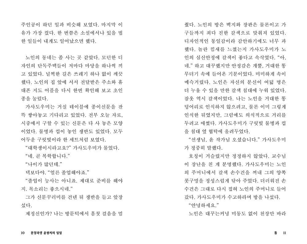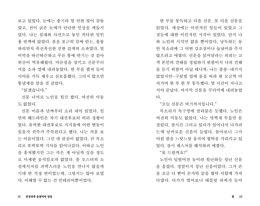 혼자 이런저런 실험을 해 보기도 했다. 가령 낭독 속도를 빠르게도 느리게도, 목소리를 크게도 작게도 해 봤지만 노인은 아무런 반응도 보이지 않았다. 몇몇 기사를 빼먹어도 마찬가지였다. 나는 요령을 피워 낭독시간을 줄일까 생각해 봤지만, 그러지는 않았다. 매 기사를 빠짐없이, 또박또박 정확하게 읽었다. 직업 정신이나 첫날의 고맙다는 인사 때문은 아니었다. 그냥 좀, 불쌍했다. 산송장이 되어서도 세상 돌아가는 사정을 다 알고자 하는 게 왠지 서글피 느껴졌다. 이러한 나의 연민은 높이 평가할 게 못 됐다. 연민이란 본디 차갑다. 차가운 연민을 팔팔 끓이고 후후 불어 따뜻한 친절인 마냥 떠먹이는 일은 아름답지 않다. 역겨운 일이다.