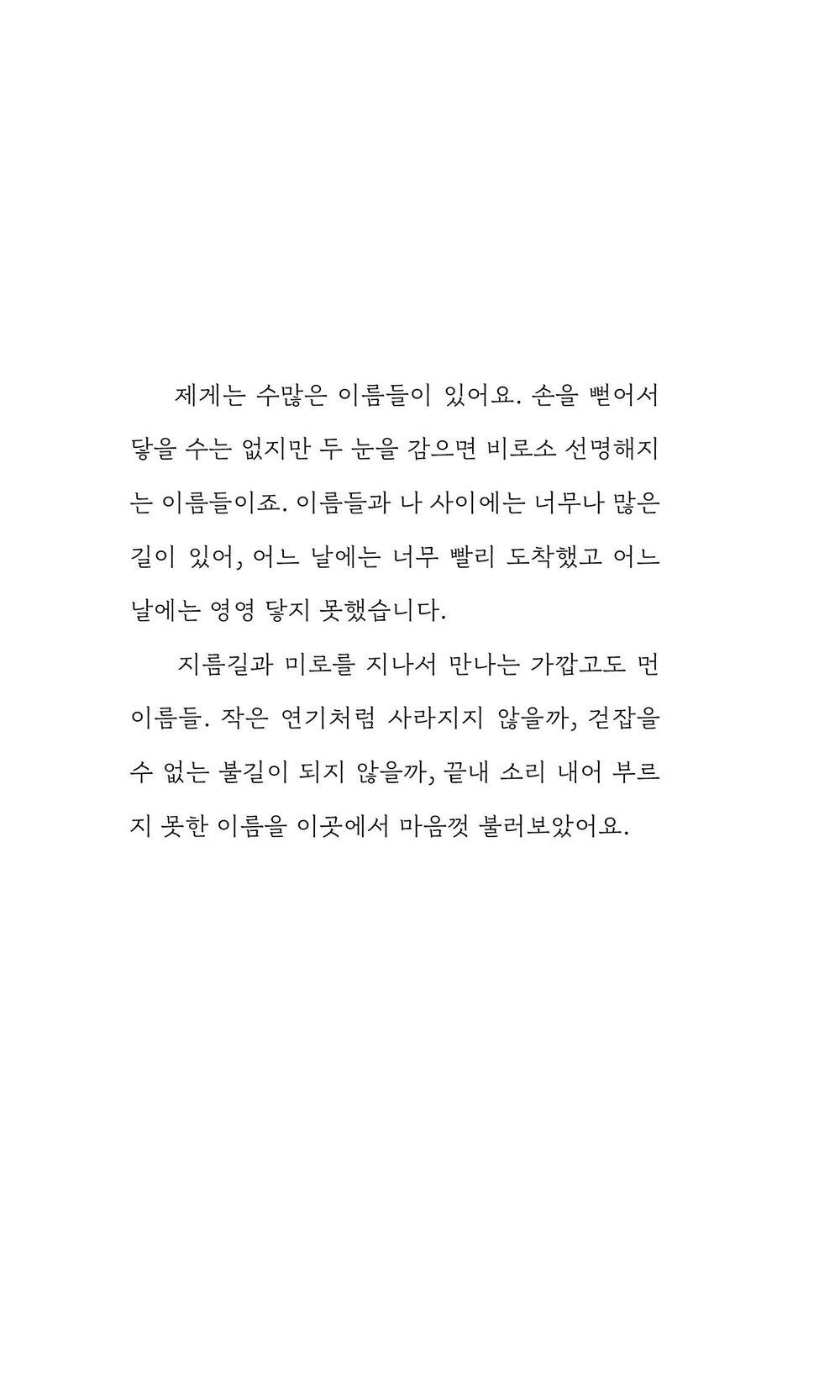 책을 덮고 나면 당신의 가슴속, 좁고 깊은 방에 가둬둔 이름들을 해방시켜줄 수 있기를.