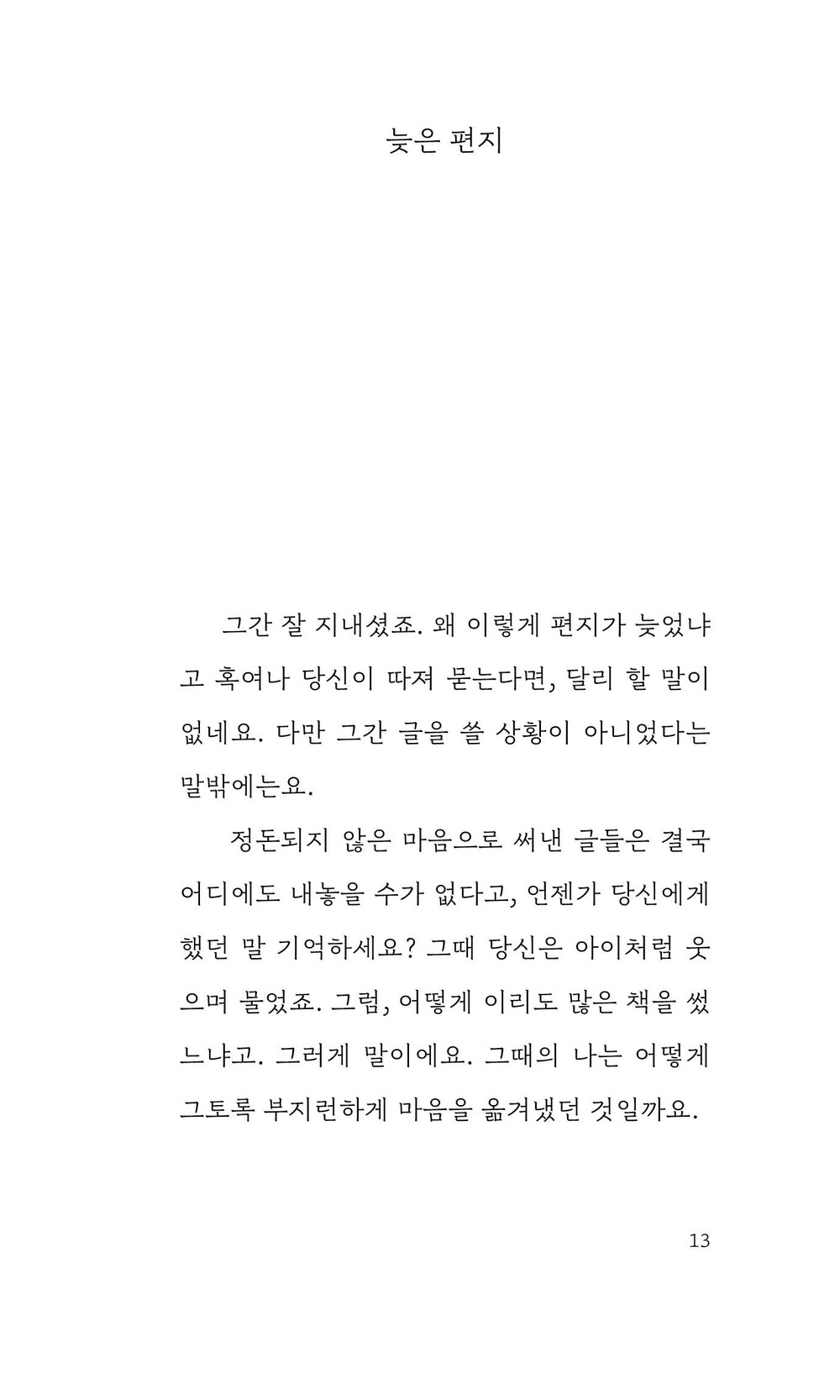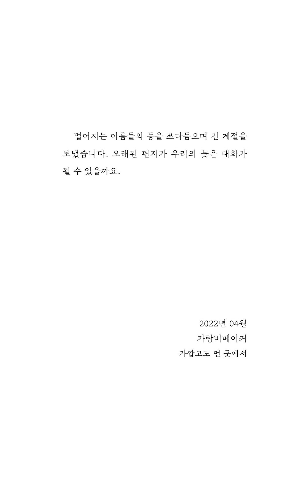 “제게는 수많은 이름들이 있어요. 손을 뻗어서닿을 수는 없지만 두 눈을 감으면 비로소 선명해지는 이름들. (중략) 멀어지는 이름들의 등을 쓰다듬으며 긴 계절을 보냈습니다. 오래된 편지가 우리의 늦은 대화가 될 수 있을까요.”