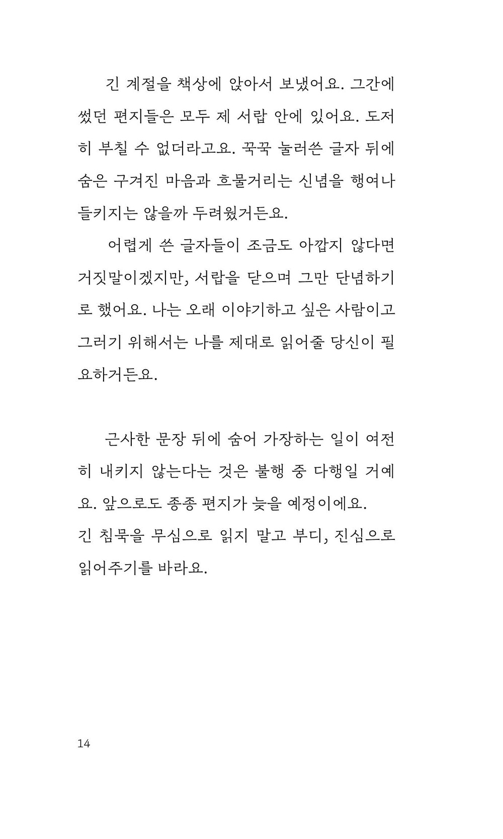 어렵게 쓴 글자들이 조금도 아깝지 않다면 거짓말이겠지만, 서랍을 닫으며 그만 단념하기로 했어요. 나는 오래 이야기하고 싶은 사람이고 그러기 위해서는 나를 제대로 읽어줄 당신이 필요하거든요.