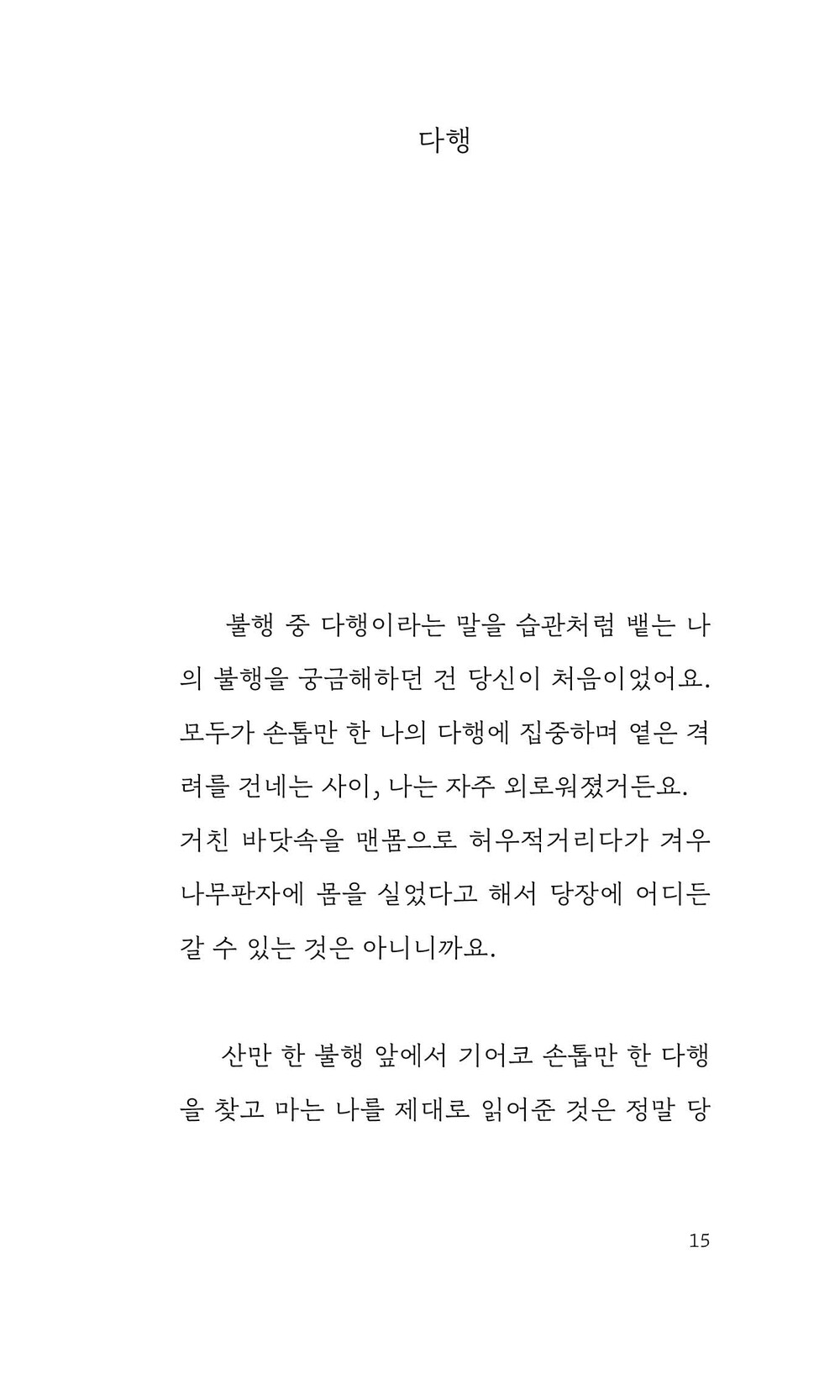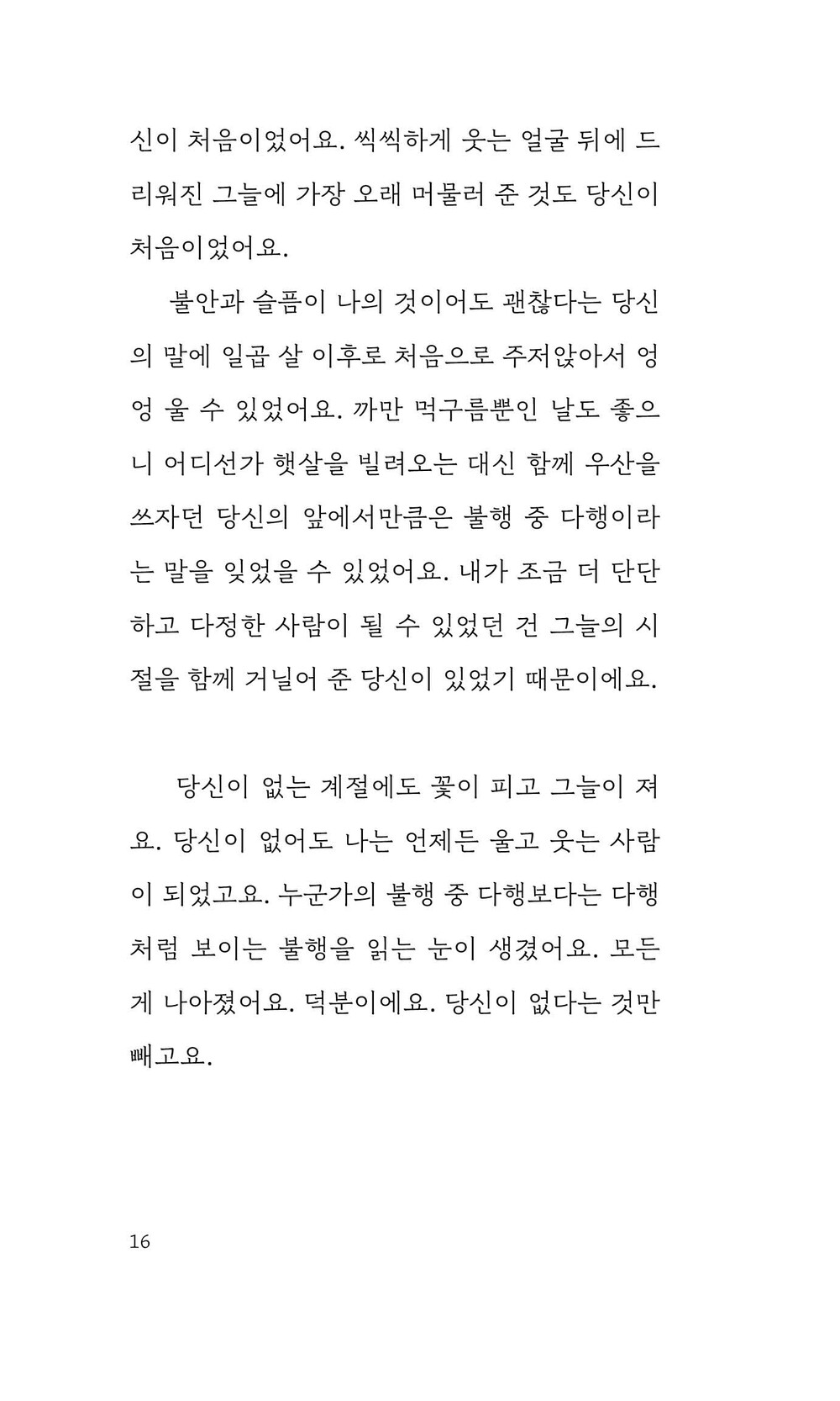 까만 먹구름뿐인 날도 좋으니 어디선가 햇살을 빌려오는 대신 함께 우산을 쓰자던 당신의 앞에서만큼은 불행 중 다행이라는 말을 잊었을 수 있었어요. 내가 조금 더 단단하고 다정한 사람이 될 수 있었던 건 그늘의 시절을 함께 거닐어 준 당신이 있었기 때문이에요.