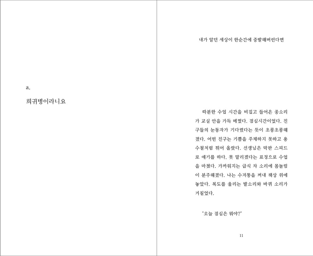 “ 오랜만에 꿈을 꾸었다. 그 애의 꿈이었다. 언제부터인가 데이트하는 꿈을 꾸면 항상 그가 나왔다. 하지만 사랑을 고백하려고 하면, 꿈에서 깨어났다. 그러나 그 날은 달랐다.”