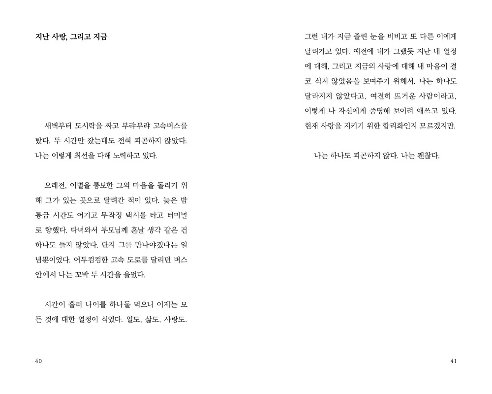 사랑을 할 때는 당장 이 사람이 아니면 안 될 것만 같고, 그가 없는 삶은 상상조차 하기 힘들다. 그래서 너무 많은 마음을 줘 버린다. 늘 진심이었으니까. 매 순간 최선을 다해 사랑했고 후회하지 않을 만큼 내 모든 걸 쏟아부었다. 언제나 상처를 주고 상처를 받는 것으로 끝이 났지만 그럼에도 나는 또 다른 사람을 만나 그와 새로운 미래를 그리고 지키지도 못할 무수한 약속들을 했다.