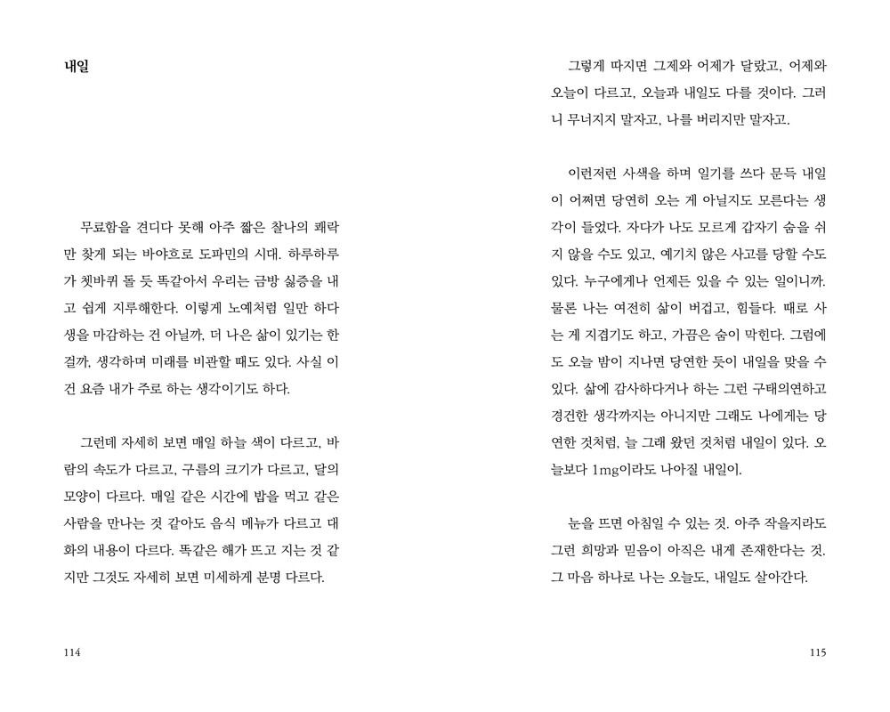 물론 나는 여전히 삶이 버겁고, 힘들다. 때로 사는 게 지겹기도 하고, 가끔은 숨이 막힌다. 그럼에도 오늘 밤이 지나면 당연한 듯이 내일을 맞을 수 있다. 삶에 감사하다거나 하는 그런 구태의연하고 경건한 생각까지는 아니지만 그래도 나에게는 당연한 것처럼, 늘 그래 왔던 것처럼 내일이 있다. 오늘보다 1mg이라도 나아질 내일이.