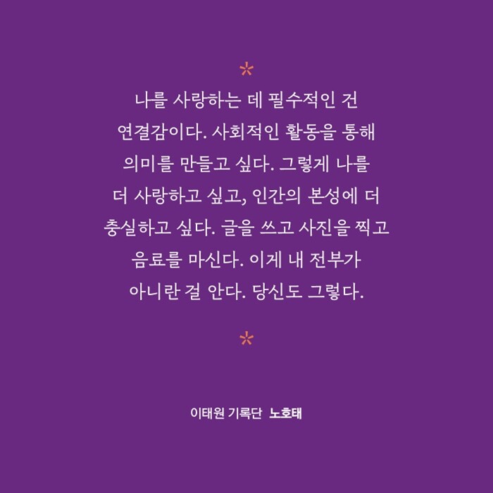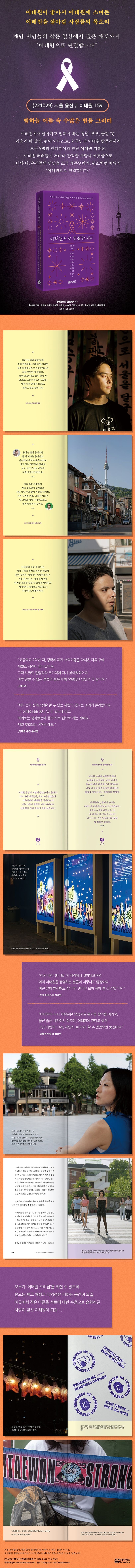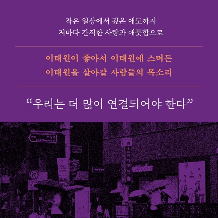 “이태원 참사 2주기가 다가왔다. 많은 사람들이 이태원에서 슬퍼하고 분노한 지도 2년이 되었다. 아직도 믿기 힘든 그날이다. 지난 시간 동안 이태원 참사가 다뤄지는 과정을 보면서 마냥 슬퍼할 수만은 없다는 것을 체감했다. 참사를 오래 기억하지 않는다면 건강한 문화를 가진 지역 공동체도 만들 수 없다고 생각했다. ‘다른 누군가에게 이태원이란 무엇일까?’ 그 질문에서 출발했다. 이태원에서 살아가는 사람들 각자의 이야기로 이태원이라는 공간과 참사에 대해 듣고 싶었다.”(210쪽)