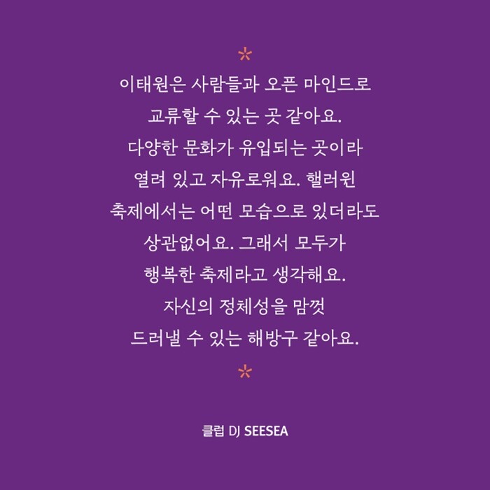 낯가림이 심한 승연씨에게 핼러윈은 곧 일탈의 기회다. 캐릭터 분장이 부끄럽기도 잠시, 이태원에서만큼은 금세 자신감이 솟는다. 나중에는 낯선 이에게 먼저 다가갈 만큼 적극적이다. 그건 아마 타인의 시선으로부터 자유로워진 덕분일 것이다. DJ SEESEA씨에게 핼러윈은 자신의 정체성을 맘껏 드러낼 수 있는 해방구이자 모두가 행복한 순간이다. 모르는 사이라도 서로 눈을 맞추고 자연스럽게 인사를 건넬 수 있는 이 축제에 많은 이들이 참여해 온 시간은 바로 이러한 까닭에서 연유한다. 2022년 10월 29일 그날도 마찬가지로.