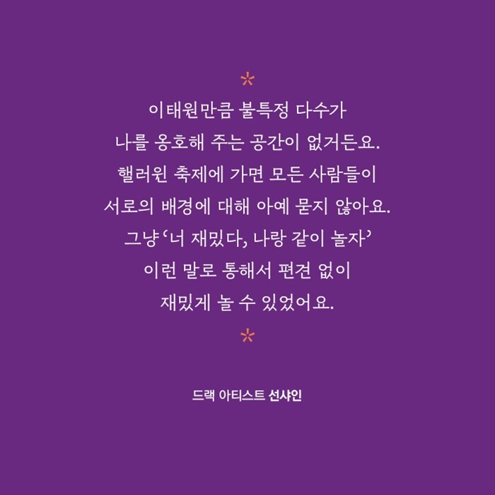 “이겨 내야 했어요. 이 지역에서 살아남으려면. 왜냐하면 이제 이태원을 경험하는 분들이 너무나도 많잖아요. 이렇게 재밌는 공간이 있다는 걸. 그러니까 더 괜찮다고 보여 줘야 할 것 같은 느낌인 거죠. 이런 일이 발생해도 잘 이겨 낸다고 보여 줘야 할 것 같았어요.”(133쪽)