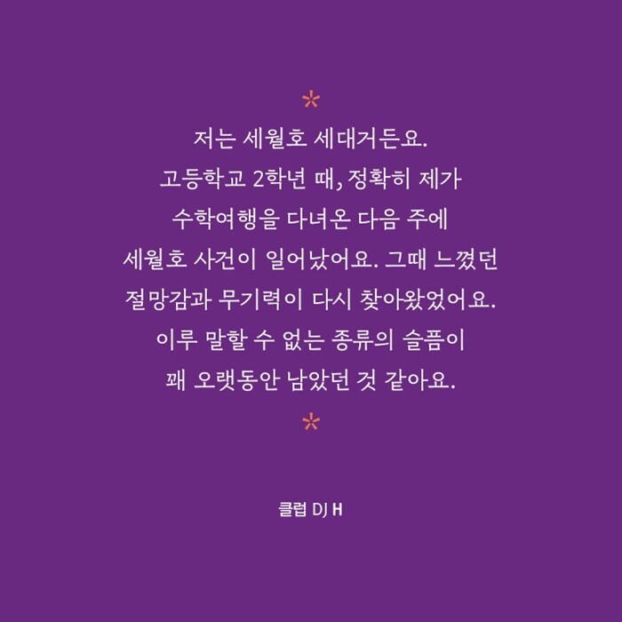 “저는 세월호 세대거든요. 고등학교 2학년 때, 정확히 제가 수학여행을 다녀온 다음 주에 세월호 사건이 일어났어요. 그때 느꼈던 절망감과 무기력이 다시 찾아왔었어요. 이루 말할 수 없는 종류의 슬픔이 꽤 오랫동안 남았던 것 같아요.”(184쪽)
