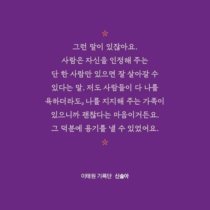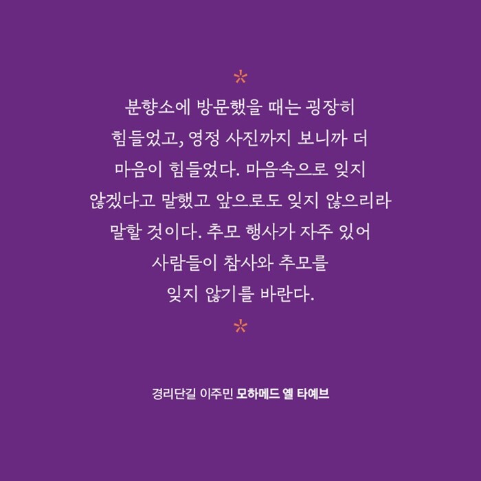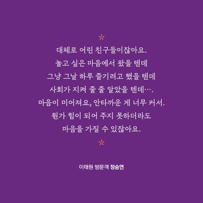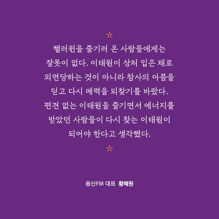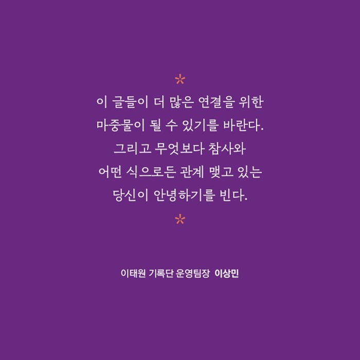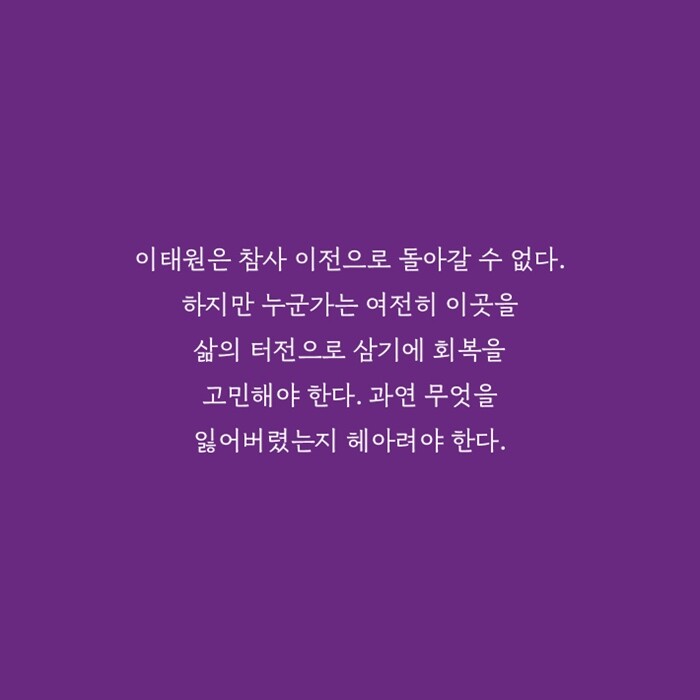 “피해자들 모두에게는 하나로 뭉뚱그릴 수 없는 각기의 다양한 이야기들이 있습니다. 그 많은 이야기들을 하나하나 소중히 여기면서 기억하고 마음으로 함께하기를, 그렇게 이태원 그 자리가 다시 새롭게 채워지고 샘솟을 수 있기를 간절히 바랍니다.”