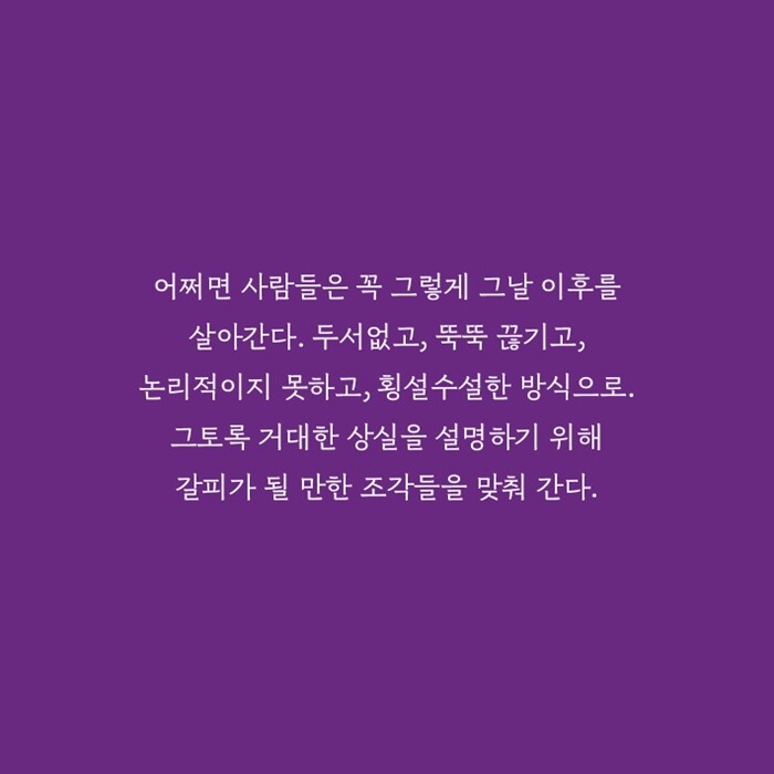 참사가 모두에게 상처를 남겼다면 모두에게 치유가 필요한 것은 당연한데, 정작 그 상처를 서로 내보일 수 있는 관계를 찾기란 너무도 어렵다. 그보다는 단순한 구호로 복잡한 심경을 대체하는, 타인의 진의를 함부로 재단하고 왜곡하는, 심지어 고통에 몸부림치는 사람들을 조롱하고야 마는 풍경이 차라리 익숙하다. 그사이 상처는 안으로 곪을 수밖에 없는 걸까. 침묵, 편견과 혐오, 죄책감과 답답함, 상실, 일상과 애도 등 전부 참사의 영향권 아래 있다. 해결 역시 그만큼 거대해야 하지 않을까.(243쪽)