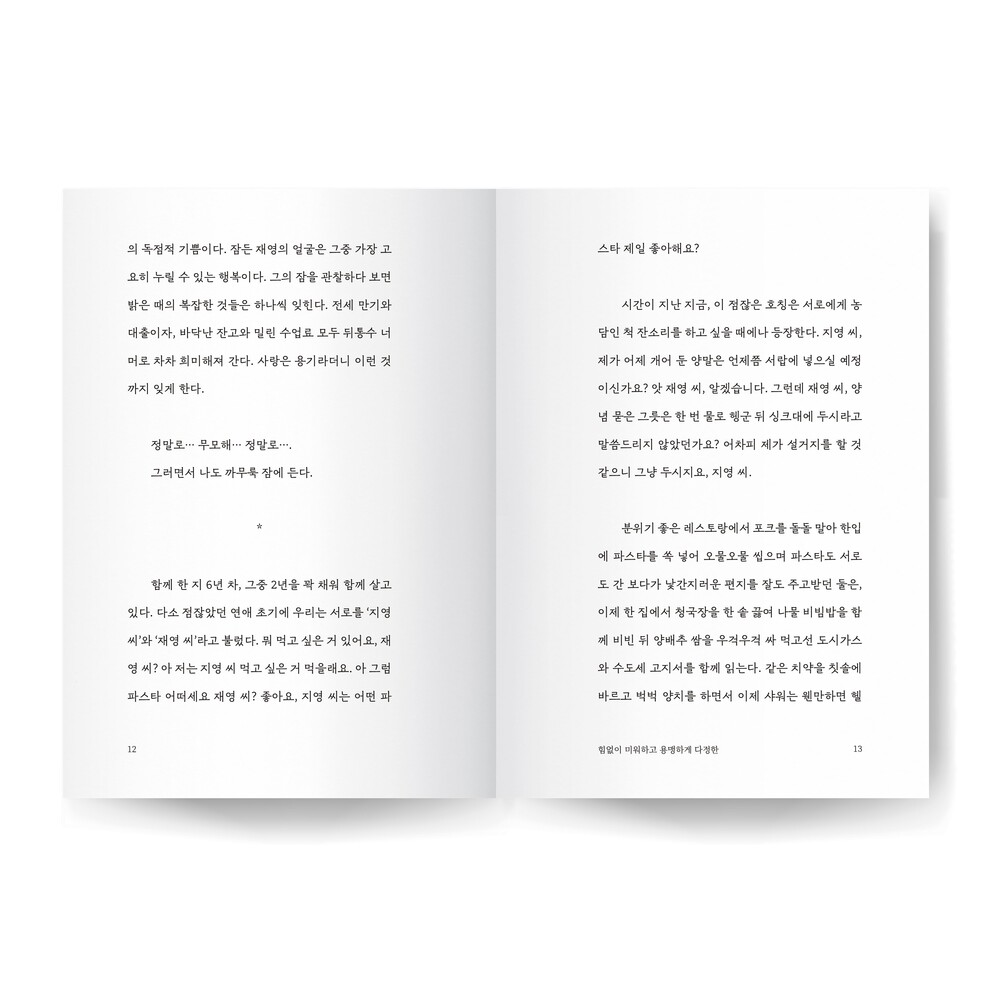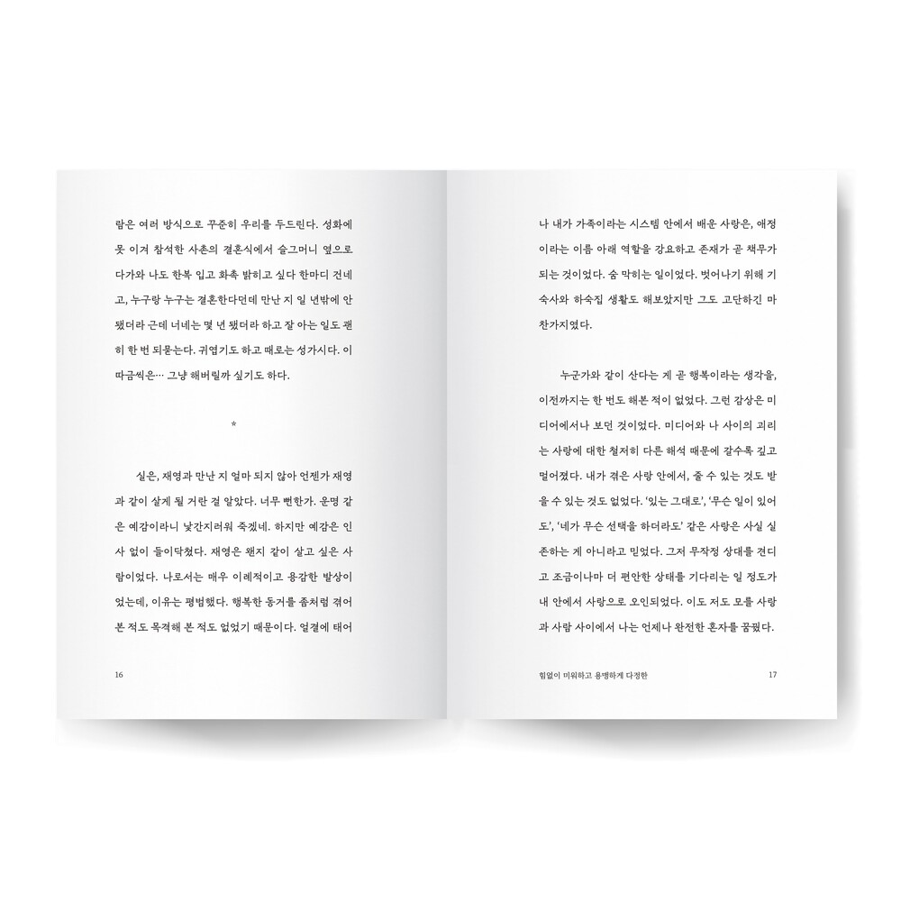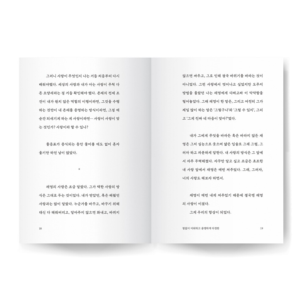 그가 닦아둔 사랑이 나를 자유롭게 했다. 그 자유 안에서 그제야 내가 어떻게 말하고 듣고 행동하고 쓰고 싶은지 다시 고민할 수 있었다. 그러니까, 거기서부터 나는 나를 다시 키웠다. 재영과 오래도록 눈 맞추고 토라지고 화를 내고 대화하며 그제야 나는 배웠다. 어떤 내가 될 것인지는 어쩌면 선택의 문제라는 걸. 아무런 선택을 하지 않아도 그건 그대로 나여서 괜찮을 수도 있다는 걸.