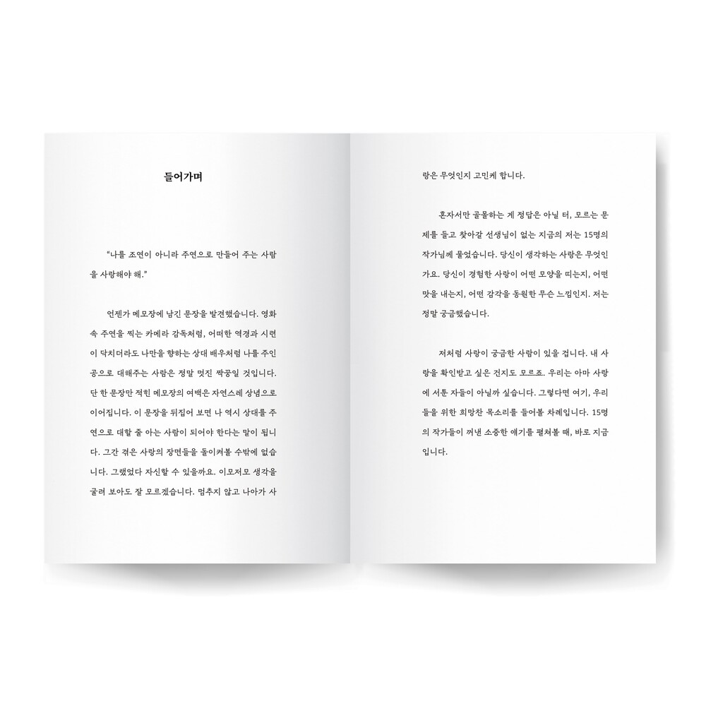 15명의 작가들이 꺼낸 소중한 이야기를 읽은 뒤 한 가지 확실하게 깨달은 것은 사랑만이 가능하게 하는 일이 분명 있음입니다.
