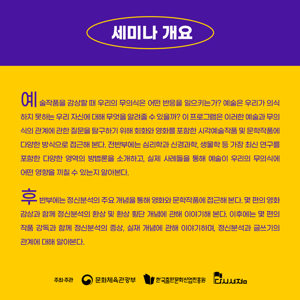 예술작품을 감상할 때 우리의 무의식은 어떤 반응을 일으키는가? 예술은 우리가 의식하지 못하는 우리 자신에 대해 무엇을 알려줄 수 있을까? 이 프로그램은 이러한 예술과 무의식의 관계에 관한 질문을 탐구하기 위해 회화와 영화를 포함한 시각예술작품 및 문학작품에 다양한 방식으로 접근해 본다. 전반부에는 심리학과 신경과학, 생물학 등 가장 최신 연구를 포함한 다양한 영역의 방법론을 소개하고, 실제 사례들을 통해 예술이 우리의 무의식에 어떤 영향을 끼칠 수 있는지 알아본다. 후반부에는 정신분석의 주요 개념을 통해 영화와 문학에 접근해 본다. 몇 편의 영화 감상과 함께 정신분석의 환상 및 환상 횡단 개념에 관해 이야기해 본다. 이후에는 몇 편의 작품 강독과 함께 정신분석의 증상, 실재 개념에 관해 이야기하며, 정신분석과 글쓰기의 관계에 대해 알아본다.