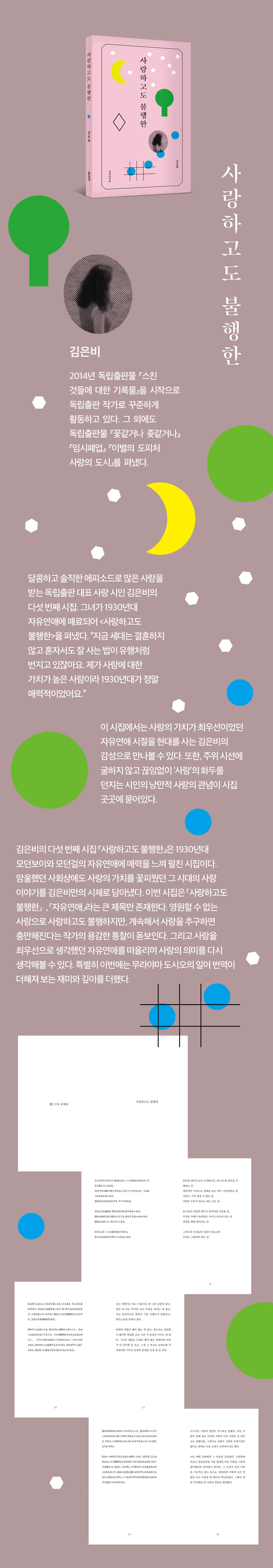 달콤하고 솔직한 에피소드로 많은 사랑을 받는 독립출판 대표 사랑 시인 김은비의 다섯 번째 시집. 그녀가 1930년대 자유연애에 매료되어 〈사랑하고도 불행한〉을 펴냈다. "지금 세대는 결혼하지 않고 혼자서도 잘 사는 법이 유행처럼 번지고 있잖아요. 제가 사랑에 대한 가치가 높은 사람이라 1930년대가 정말 매력적이었어요."