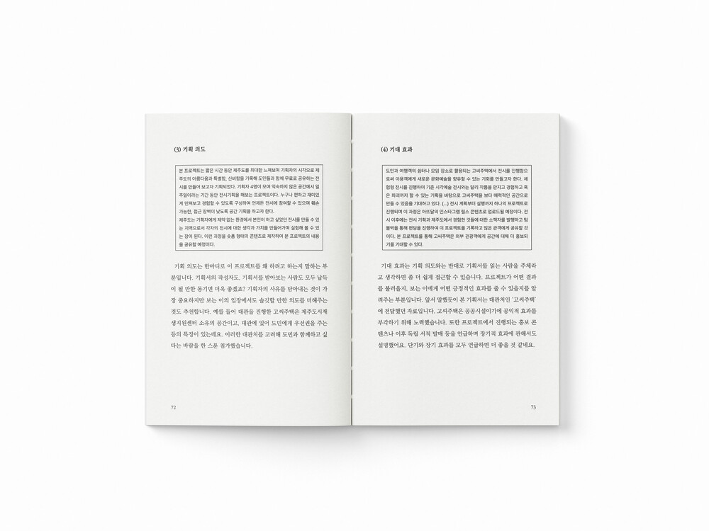 「제주도에선 아무도 몰랐다.」는 일주일 만에 제주도에서 전시를 하게 된 무모한 이야기를 중심으로, 문화예술기획이나 프로젝트 진행과정에서 유용할 팁들을 담아냈습니다.