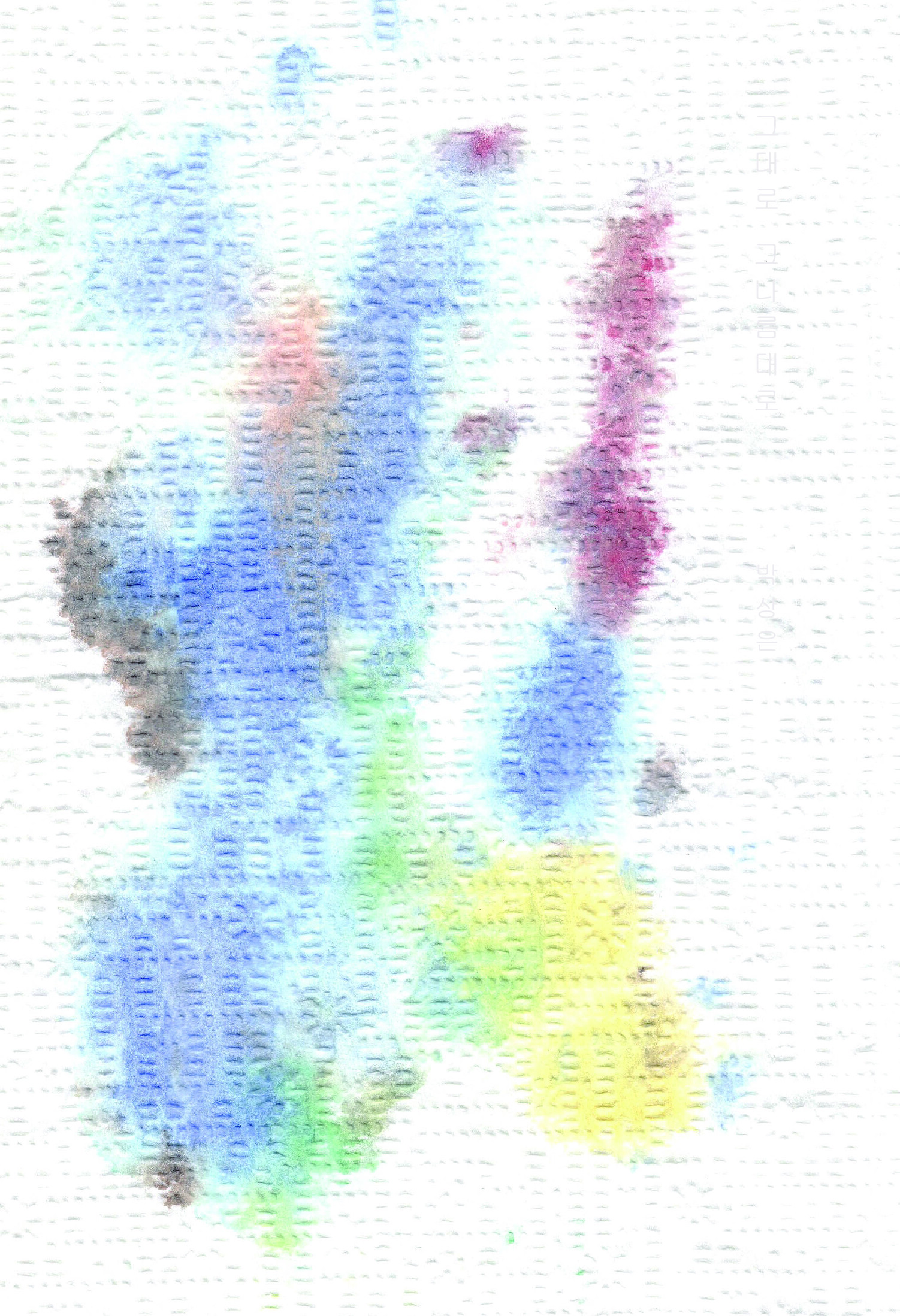 종이 위에 곧바로 칠하기 전 오래되어 거칠어진 붓의 결을 한번 다듬기 위해물통 옆에 놓아둔 티슈 위의 붓 자국에서 좋은 느낌을 받아 틈틈이 책 사이에 모아두었습니다.