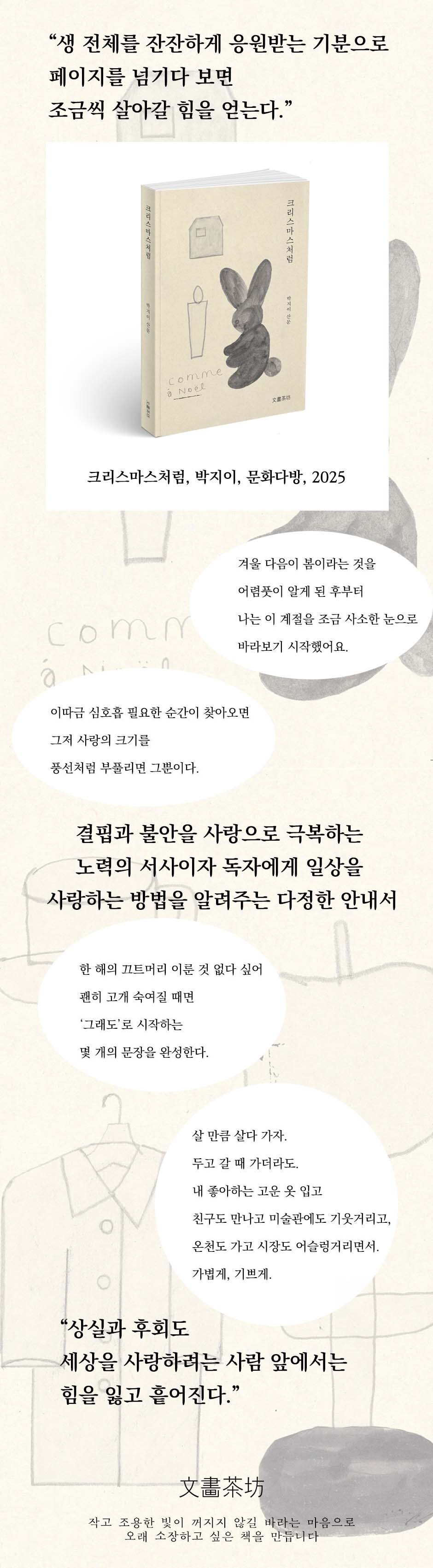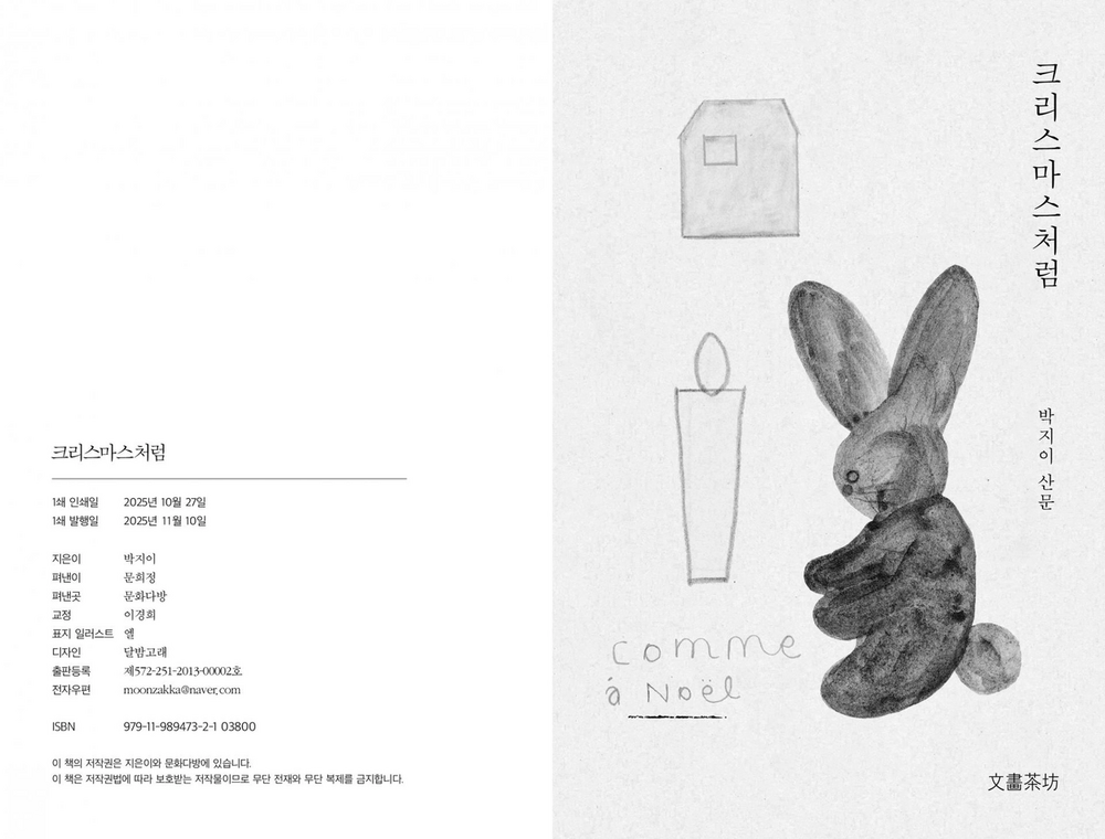 박지이 작가가 쓴 첫 번째 책 <불안을 섬기는 세계에서는 확인까지가 사랑이라>가 원고를 더해 <크리스마스처럼>으로 재출간되었다. 상실과 후회도 세상을 사랑하려는 사람 앞에서는 힘을 잃고 흩어진다. 한 사람의 생이 달라질 만큼 누군가를 귀여워하는 마음에는 힘이 있다는 작가의 말처럼 생 전체를 잔잔하게 응원받는 기분으로 페이지를 넘기다 보면 천천히, 한 뼘 한 뼘 조금씩 살아갈 힘을 얻을 수 있는 에세이. 작가에게는 결핍과 불안을 사랑으로 극복하는 노력의 서사이자 독자에게는 일상을 사랑하는 방법을 알려주는 다정한 안내서가 되어준다.