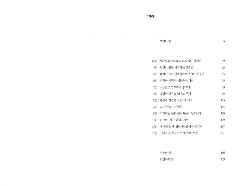 책의 수명은 출간 시기부터 한 달이라는 출판계의 생리를 이해하고 싶지 않습니다. 출간 시기와 관계없이 오래 옆에 두고 싶은 책을 만들고 있어요. ‘슬픔을 살피는’ 작가님의 글에서 ‘가여운 행복의 흔적들’을 발견하셨길 바랍니다. ‘담요의 온도를 빌린 눈빛으로’ 읽어 주세요. 감사합니다.