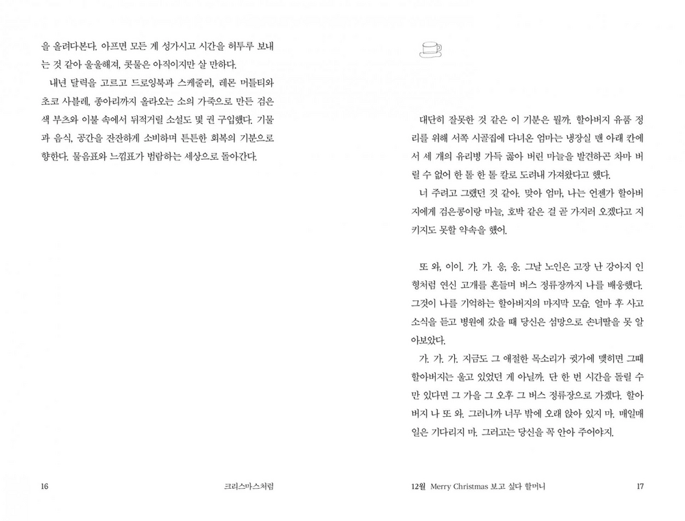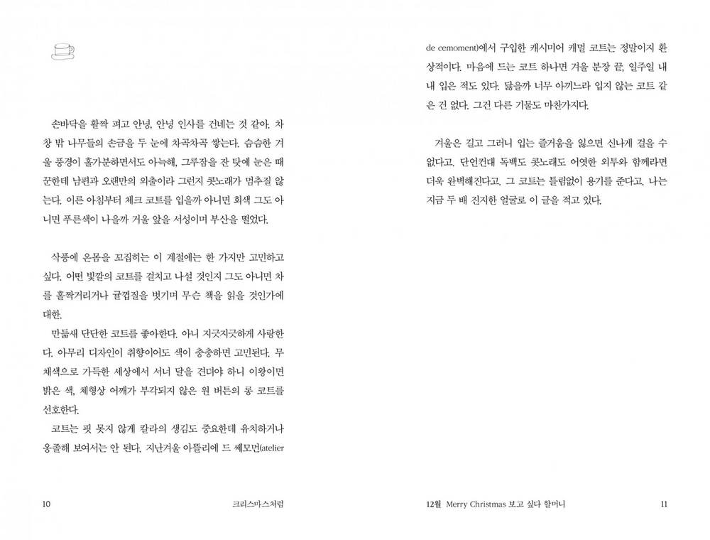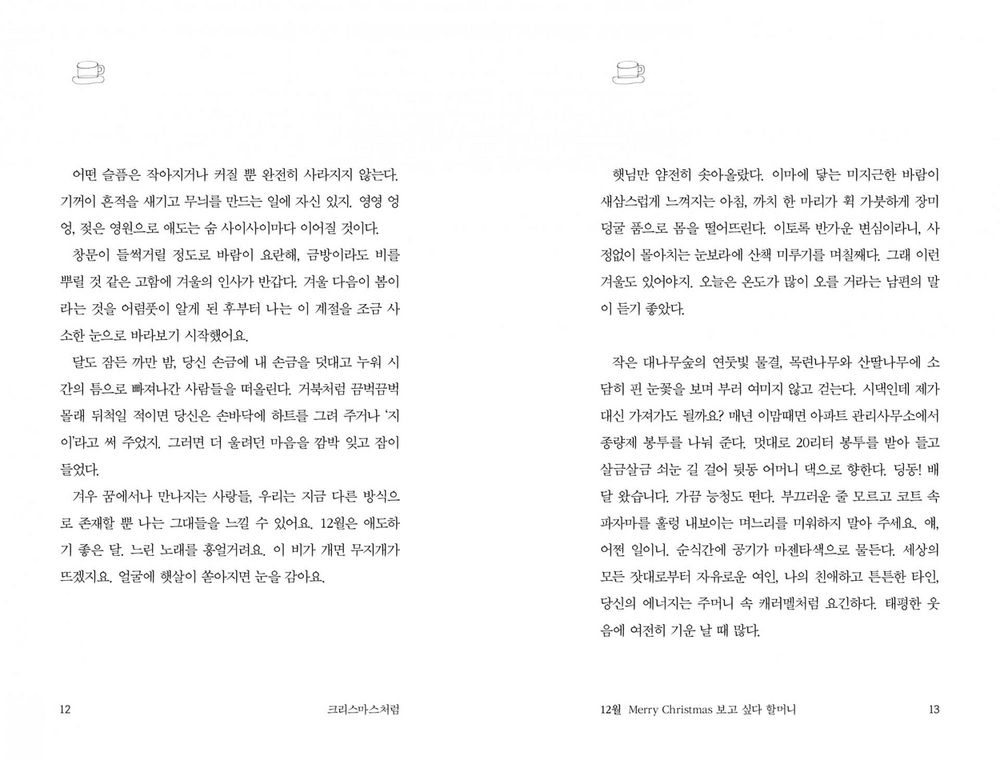 ‘크리스마스처럼’이라는 가제로 주고받던 원고는 <불안을 섬기는 세계에서는 확인까지가 사랑이라>는 이름을 달고 먼저 세상에 나왔습니다. 사랑스러운 고양이 두 마리가 홍차 잔을 들고 나란히 앉아 있는 다정한 모습으로요. 책은 무척 큰 사랑을 받았고 고맙게도 한 살 생일이 되기 전 중쇄를 찍게 되었습니다. 그런데 욕심을 좀 부렸습니다. 새 옷을 입혀 다시 성대한 생일잔치를 열어 주고 싶었어요. 그만큼 이 글을 아낀답니다. 편집자가 작가의 글을 열렬히 사랑하면 책을 이렇게 만들기도 하네요.