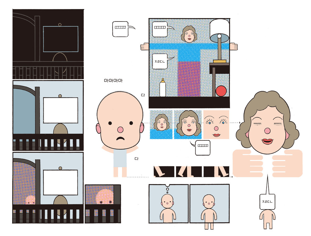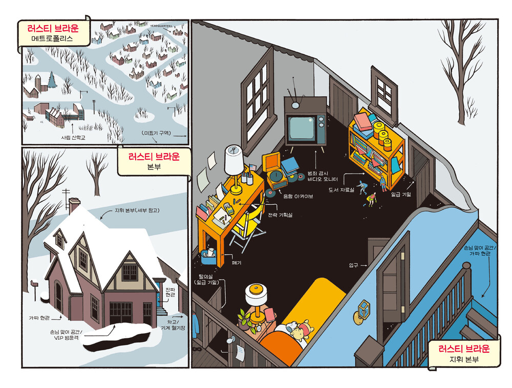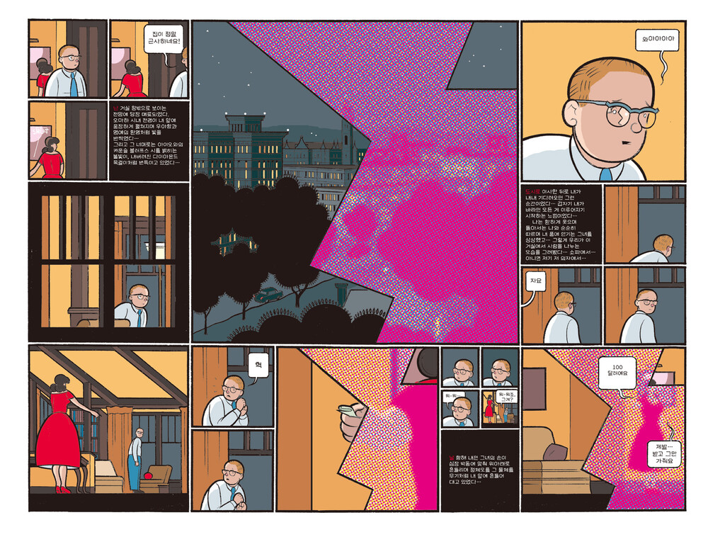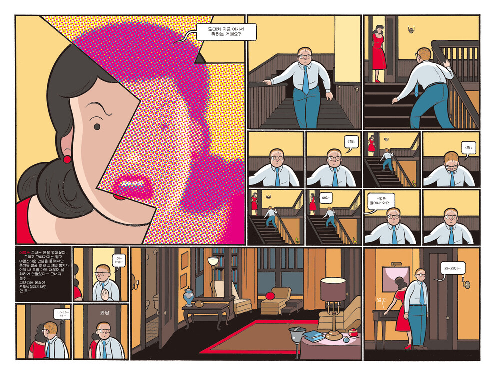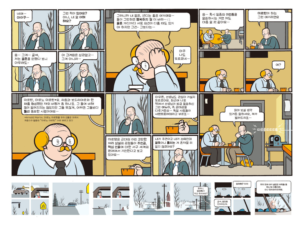 우표만 한 크기의 작은 칸들과 그 사이를 채우며 이따금 소리 지르는 의성어와 접속사는 묘한 노스탤지어를 자아냅니다. 지나치게 현실적이고 무력하며 무감정한 인물들 너머로 만화가가 그려 넣은 느낌표와 기울임꼴, 의성어, 접속사는 꽤 경쾌합니다. 여러모로 황량한 인간 군상이고 실망과 절망에 전 이들이지만, 한 사람의 막다른 골목과 낭떠러지 운명을 초월하는 돌파구를, 그 작은 틈을 이 책 말미의 ‘인터미션’이란 문구는 열어둡니다. 크리스 웨어는 더스트재킷에 『러스티 브라운』과 작가 자신에 관한 이야기(조소에 가까운 추천사까지)를, 책 산 사람들만 이해할 만한 이야기(재킷을 어떻게 접으라든지, 어떻게 보관하라든지)를 적었습니다. 읽기 어렵지만 바로 그 때문에 그의 책을 그 어떤 만화보다 오래도록 쥐게 되고, 긴 물리적인 시간을 쏟은 탓에 잊기 힘들어집니다. 양손을 가득 채우는 무거운 양장의 세계는 책을 인간과 인생에 대입하는 클리셰를 생소하게 느끼게 합니다. “형언할 수 없는 슬픔”을 감히 글과 그림으로 형용하려는 시도의 결과물은 이 만화를 읽어 치우려는, 금방 해치우고 더 중요한 걸 하려는 독자의 속도를 늦춥니다.