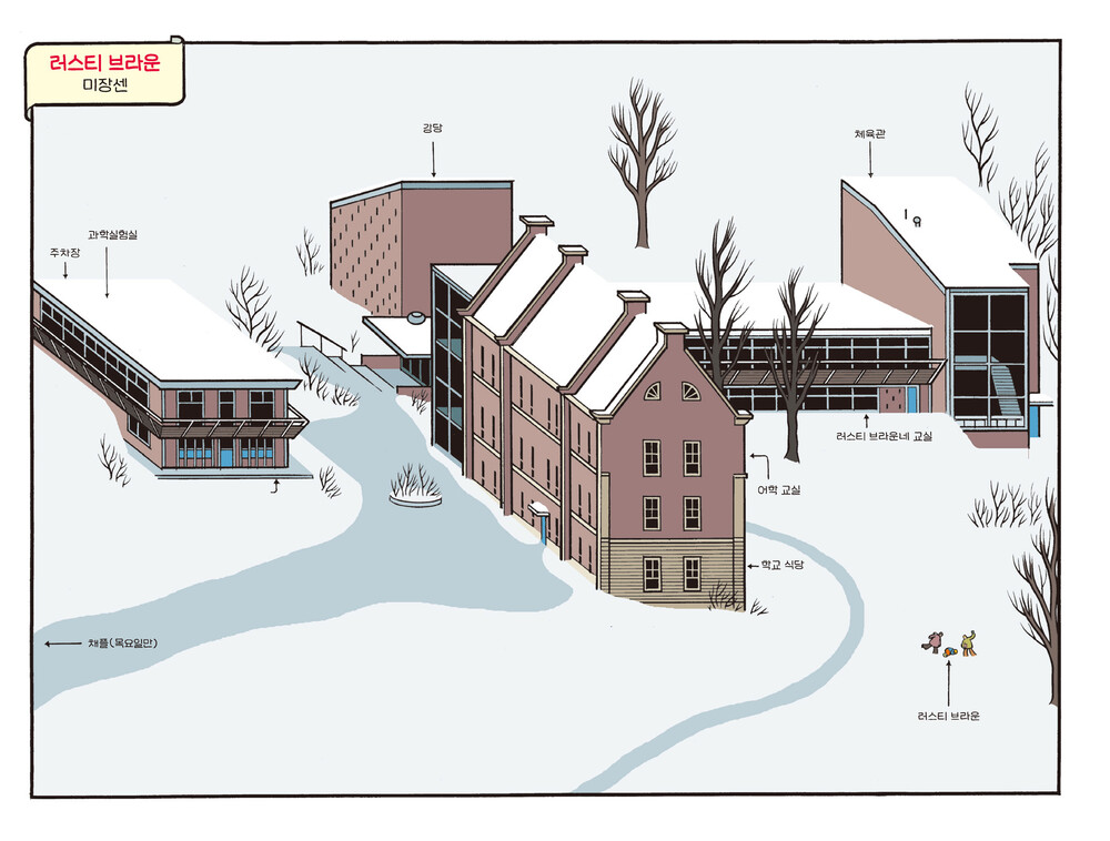 이야기에는 여섯 사람이 등장합니다. 슈퍼히어로에 집착하는 수줍은 꼬마 러스티 브라운, SF소설가 출신의 괴짜교사이자 러스티의 아버지인 우디, 러스티 반에 전학 온 남학생 초키 화이트와 초키의 누나 앨리스, 러스티를 괴롭히는 덩치 큰 소년 조던(제이슨) 린트, 이들을 가르치는 교사 조앤 콜이 그들입니다. 그들의 나이, 신분, 관심의 스펙트럼은 다양합니다. 책은 이들을 면밀히 그려내지만, 그것만으로 충분하지 않아서 얼음 결정처럼 얼어붙어 있는 풀리지 않는 서사는 독자가 채우는 수밖에 없습니다. 초등학교 과제에서 금상을 안고 집으로 돌아온 딸아이를 바라보는 어머니의 쓸쓸한 얼굴, 10대 소년의 충족되지 않는 자기애와 통제 밖 환경, 중년의 구부정한 몸으로 쏟아지는 눈, 죄책감과 치매에 휩싸인 실패한 노년의 환각 등 요람에서 무덤에 이르기까지 인간 삶이란 어디 하나 비참하지 않은 순간이 없습니다.